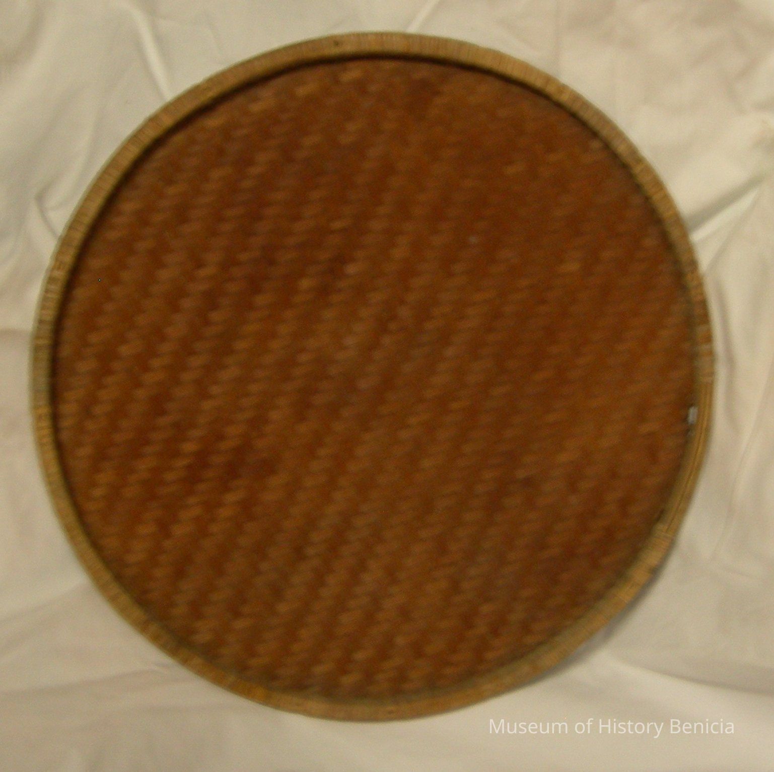 Round, flat-bottomed, woven tray with wrapped rim; 21-1/8" diameter x 7/8" depth Said to come from the Woodrow/Elenore Haun Estate.
