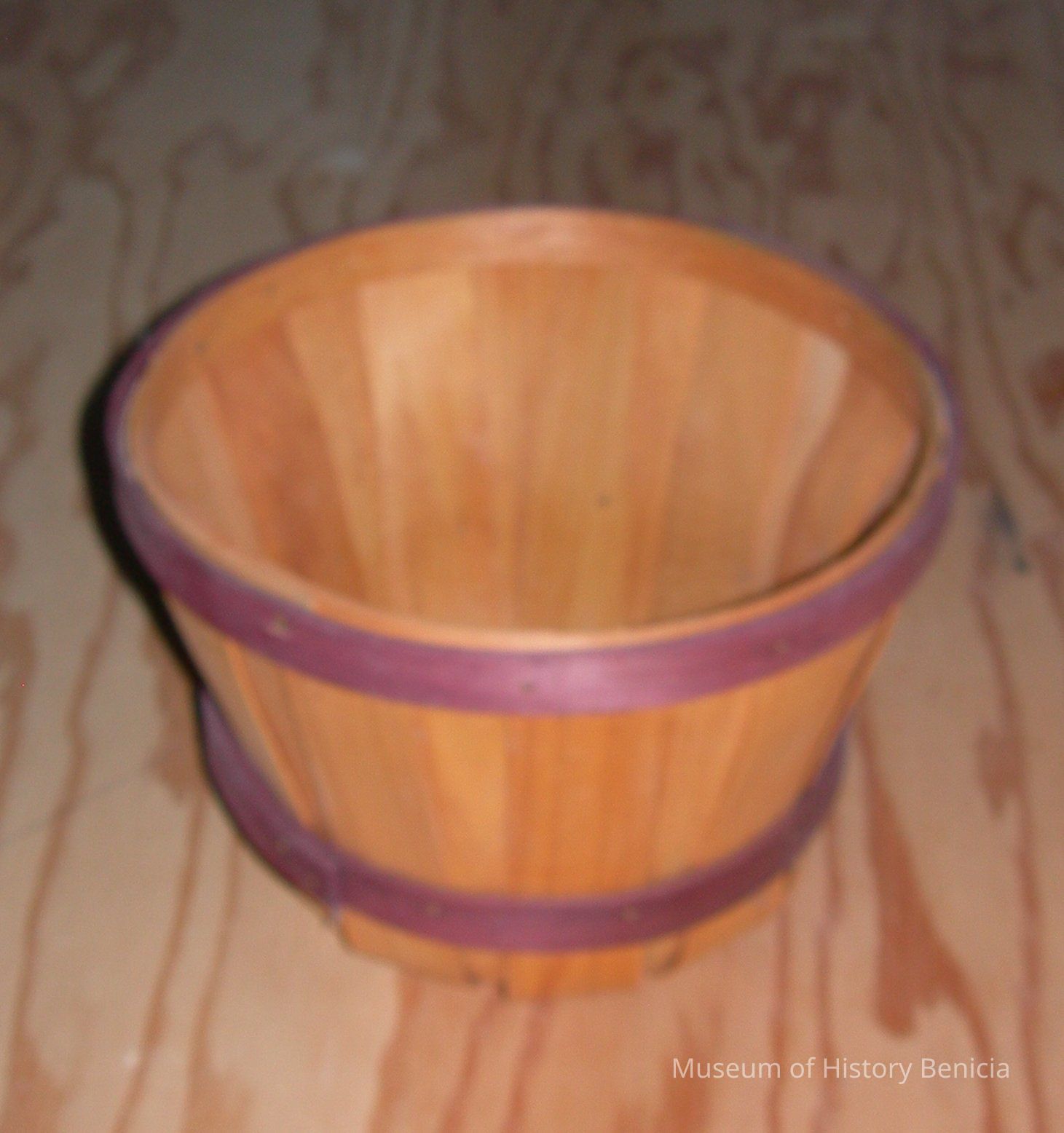 Fruit basket with two red horizontal bands arund, tan vertical strips, 7-1/2 diamet at top and 5" diameter at bottom, 8" deep