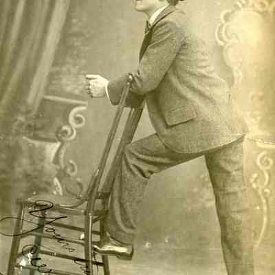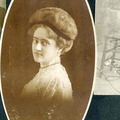 Photo album with a tooled leather cover that has the word "photographs" on the front and several colored diamonds down each side. The photo album is from the Parker/Teale families. Most pages have names written under the photos. The photos are so well documented and very firmly glued into the album that it is being kept together and photos are generally not being removed from the album.
