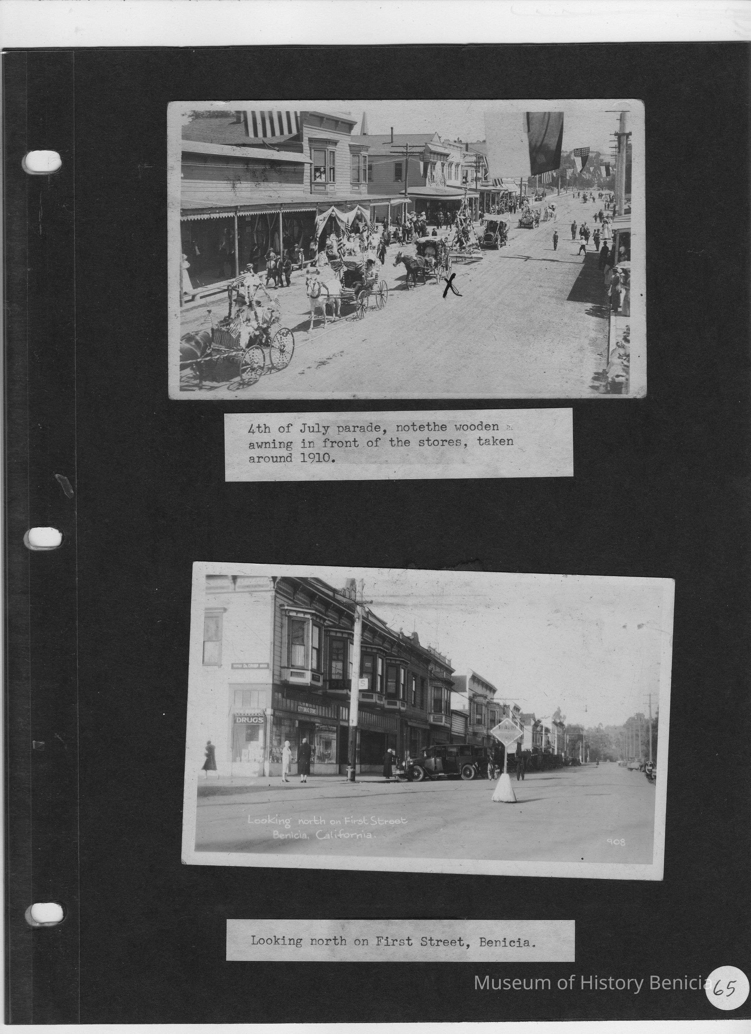 Page contains two black and white photos. Top photo shows Fourth of July parade on First Street around 1910. Bottom photo shows scene on First Street, looking north.Collection