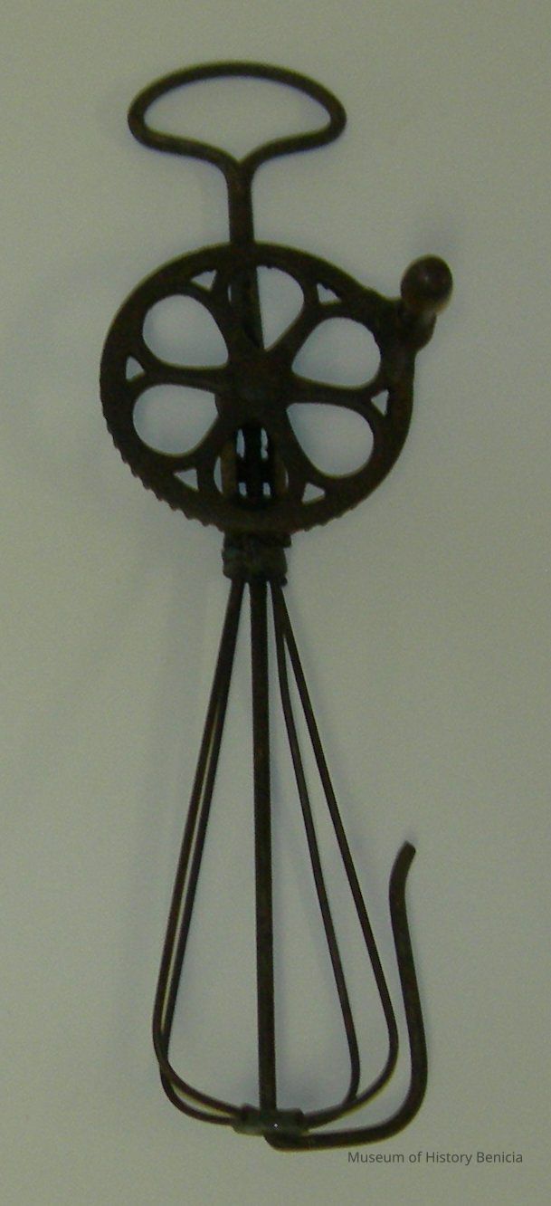 all metal egg beater; geared wheel with wood knob handle turns whisk like beaters; loop handle on top; extra piece at bottom curves up perhaps to press against bowl to keep beater straightCollection