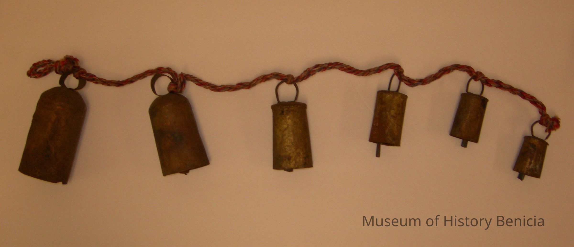 .0018g - woven and twisted multi-colored thread; knotted on loop of each bell in decending sizes from top; top has loop for hangingCollection