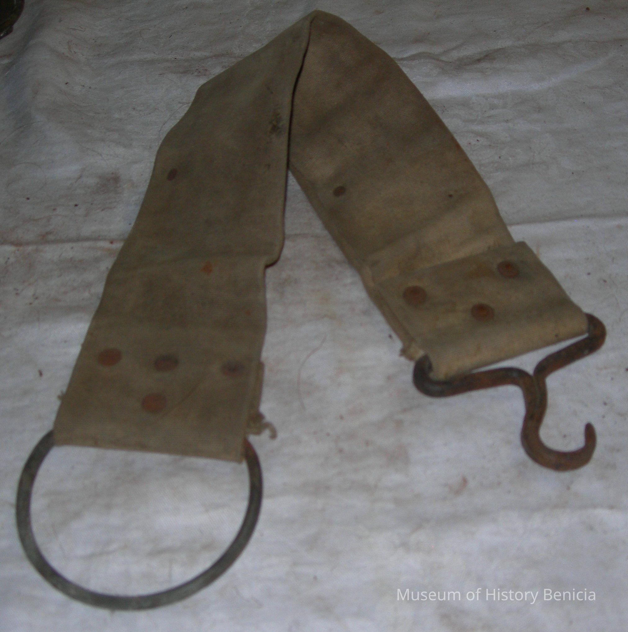 Strap used for pack animals with metal ring at one end and a hook on the other. dimensions: length: 29", width: 4", depth: 1/2"