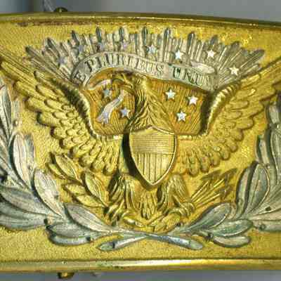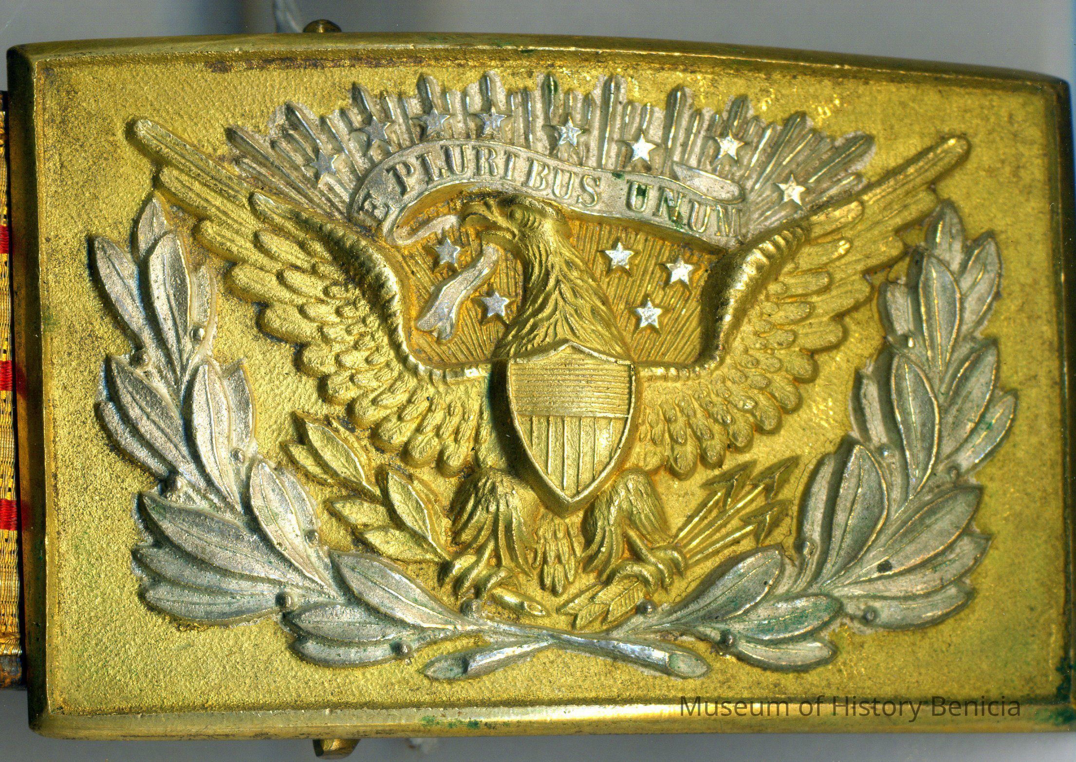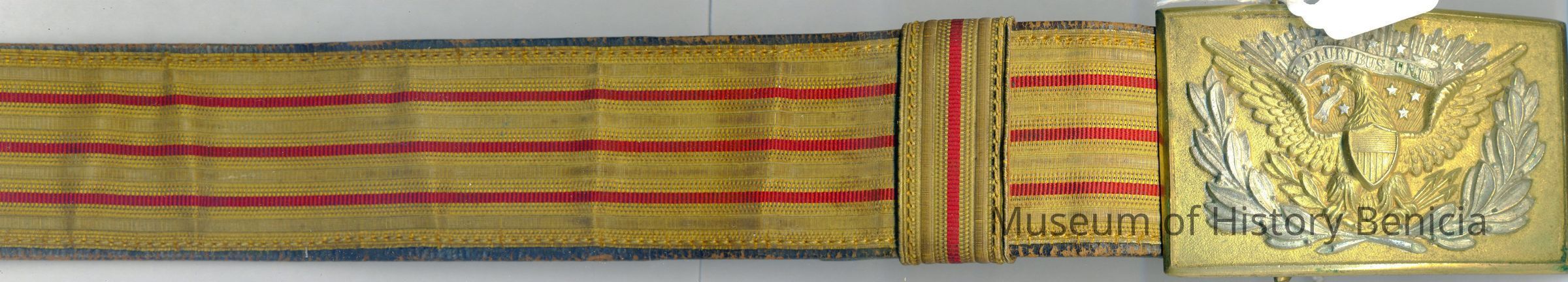 A red and gold ceremonial leather and cloth belt belonging to Oscar Zar Warner from WWI. It is about 1.75 inches wide. It has a metal clasp/buckle with an American eagle design in gold and silver. There is a leather attachment on one side with a metal hook. It may be the belt used to carry a sword.Collection