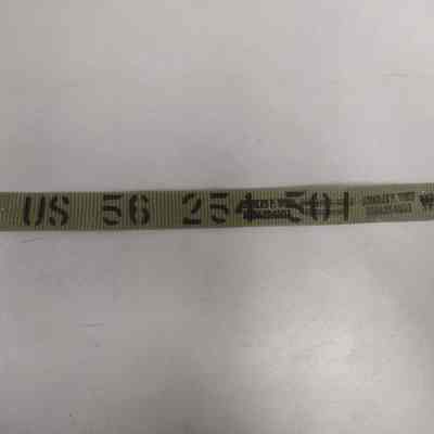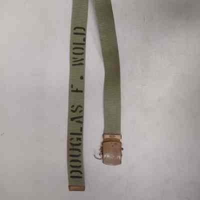 Woven, khaki, military style belt with copper-toned clasp. Labeled with Douglas F. Wold inside belt as well as other information. (duplicate of 3000.23.5.1)