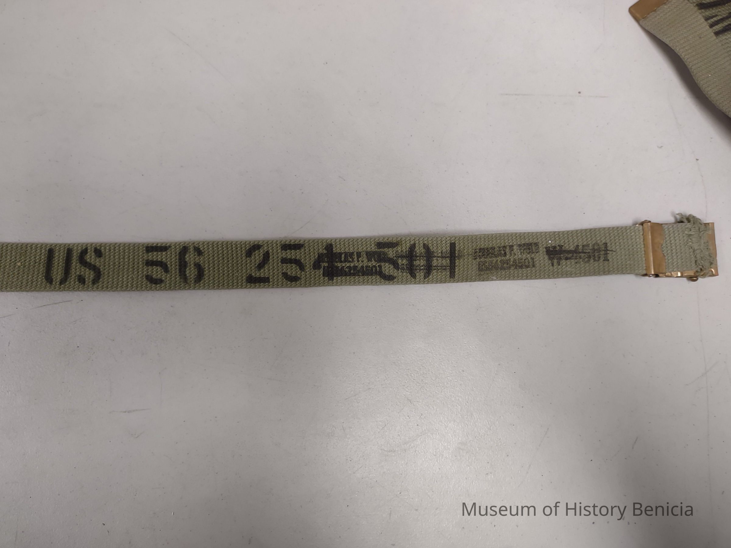 Woven, khaki, military style belt with copper-toned clasp. Labeled with Douglas F. Wold inside belt as well as other information. (duplicate of 3000.23.5.2)