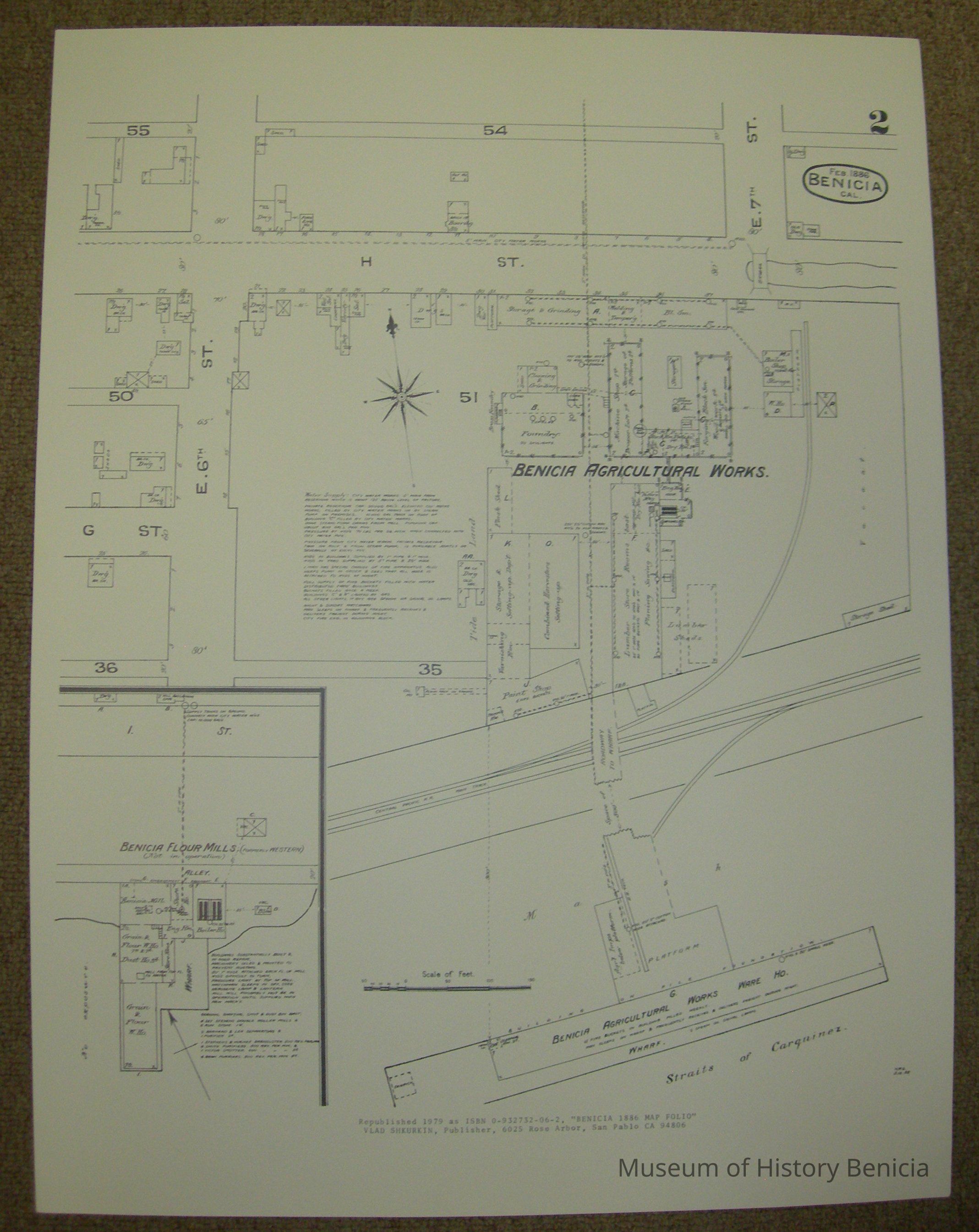 Reprints of Sanborn Map and Publishing Co. New York - Benicia February 1886 - Scale 50 ft. to an inch Published 1979 by Vlad Shkurkin, Publisher, 6025 Rose Arbor, San Pablo CA 94806 This plate shows Benicia Agricultural Works, and Benicia Flour Mills printed on heavy weight paper, almost card stock weight