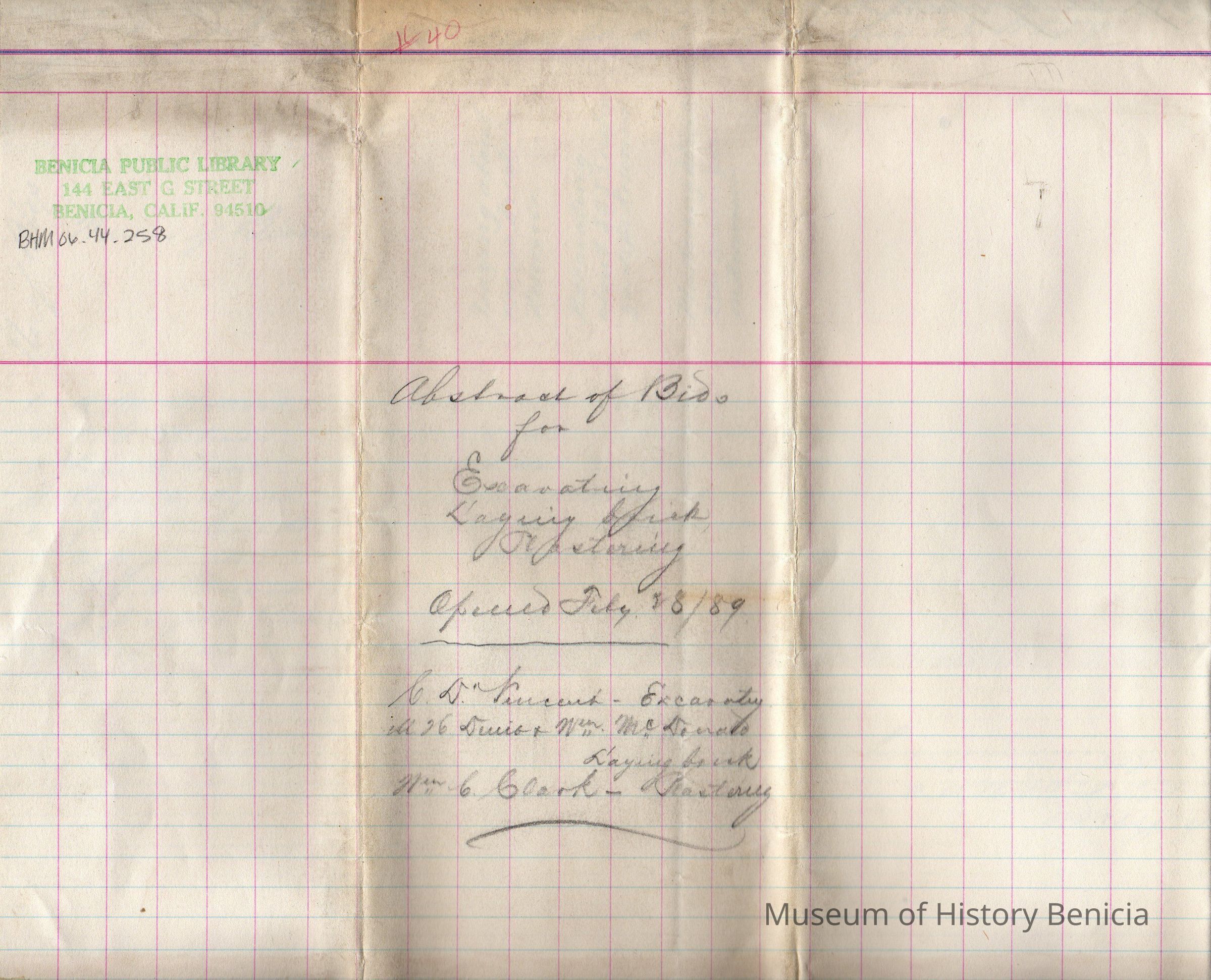 Benicia Arsenal document of bidders who responded to an advertisement from the Benicia Arsenal to build a resevoir dated Feb. 8, 1889