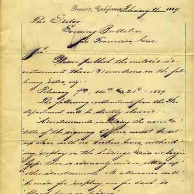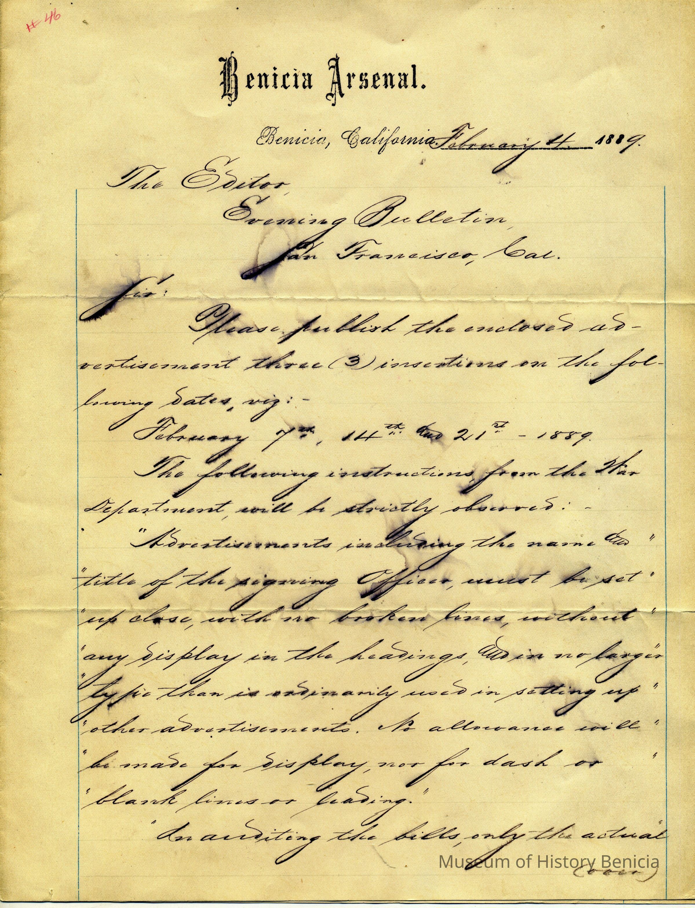 Written on Benicia Arsenal stationery dated February 4, 1889 letter of authority for publishing advertisements for excavating, laying brick, and plasterng for the new resevoir to the Evening Bulletin in San Francisco.Collection
