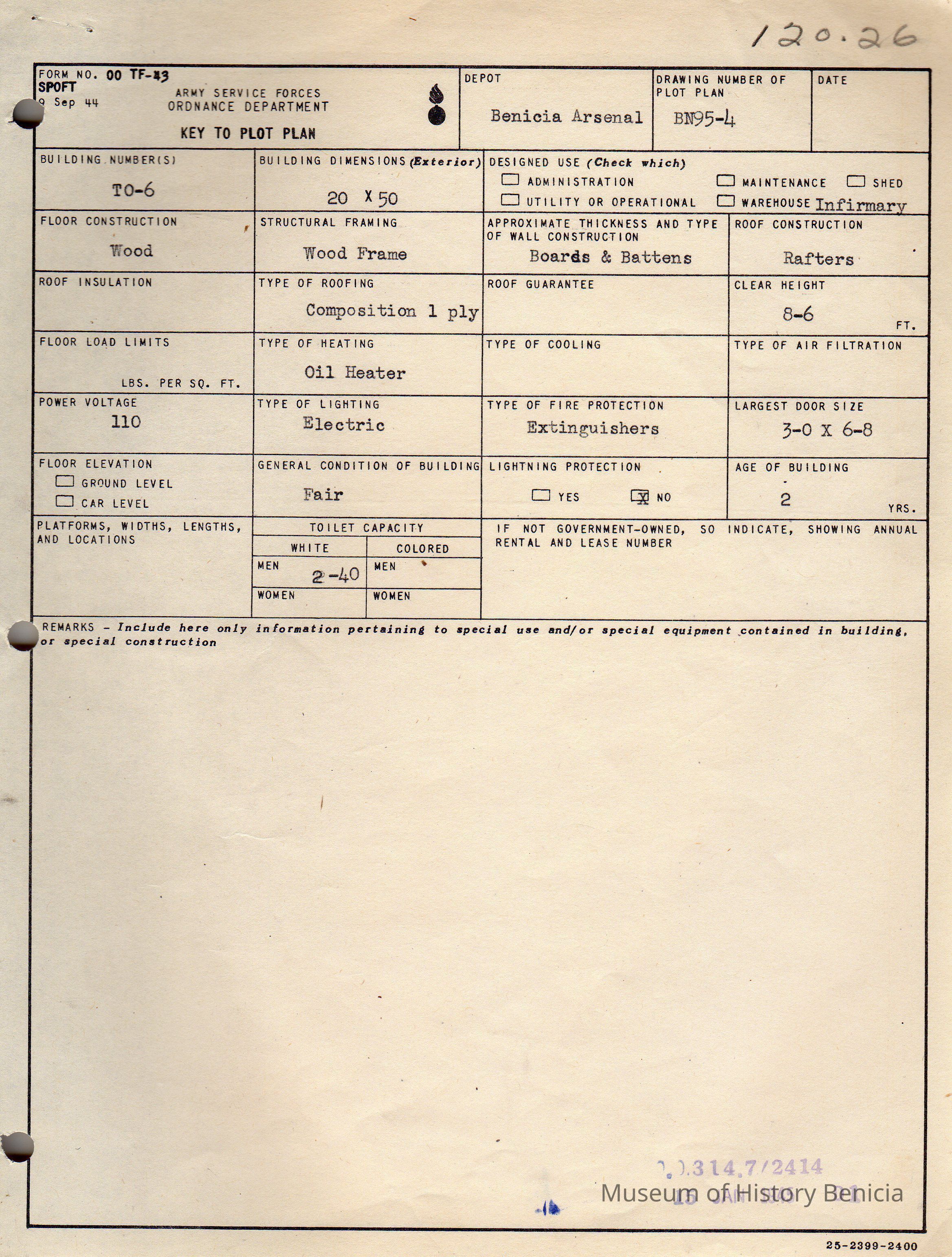 Benicia Arsenal Document. Form No. OO TF-43 SPOFT dated Dec. 15, 1944 Army Service Forces Ordnance Department, Key to Plot Plan Building TO-6.Collection