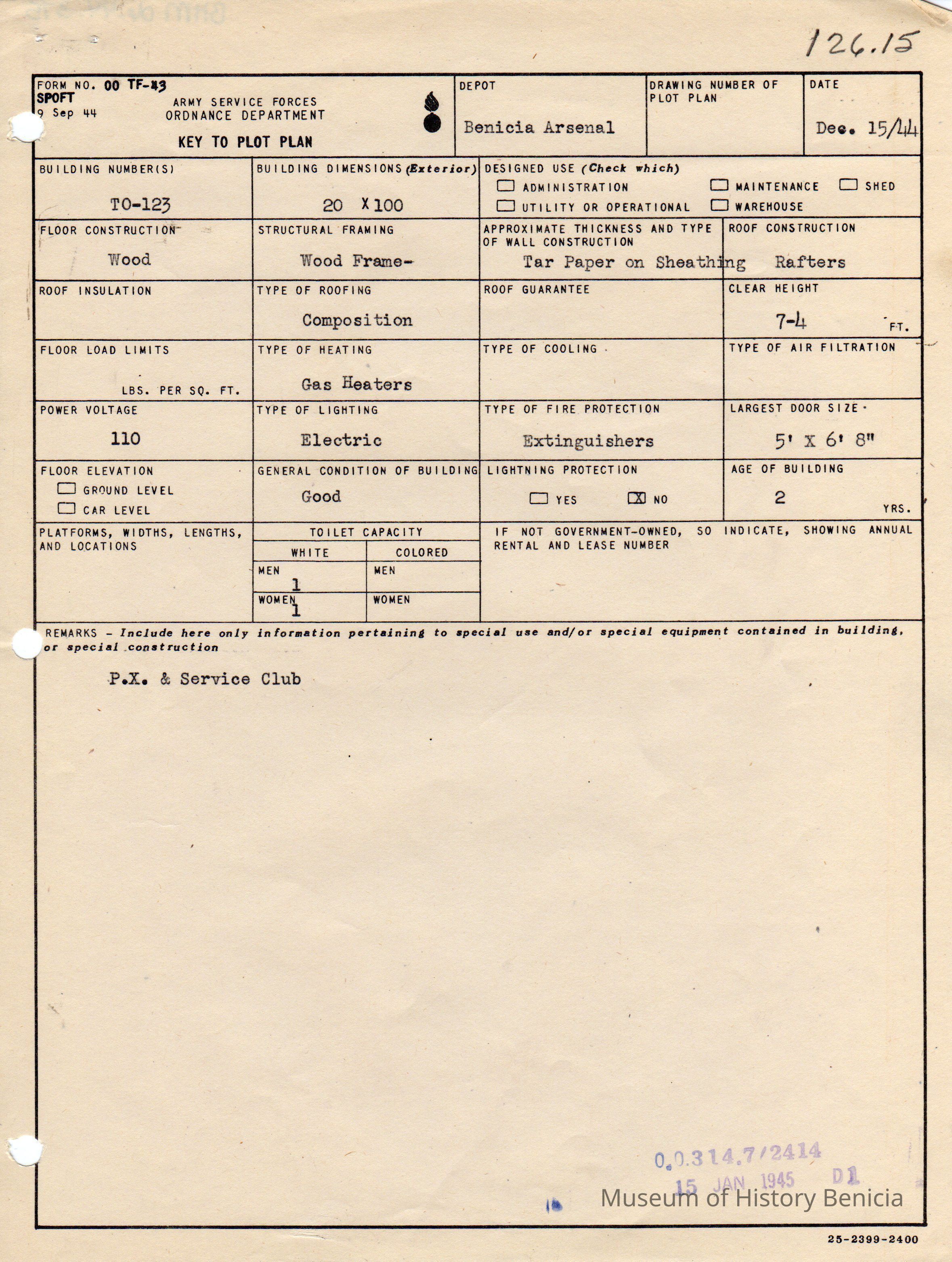 Benicia Arsenal Document. Form No. OO TF-43 SPOFT dated Dec. 15, 1944 Army Service Forces Ordnance Department, Key to Plot Plan Building TO-123 P. X. & Service Club"15 JAN 1945"Collection