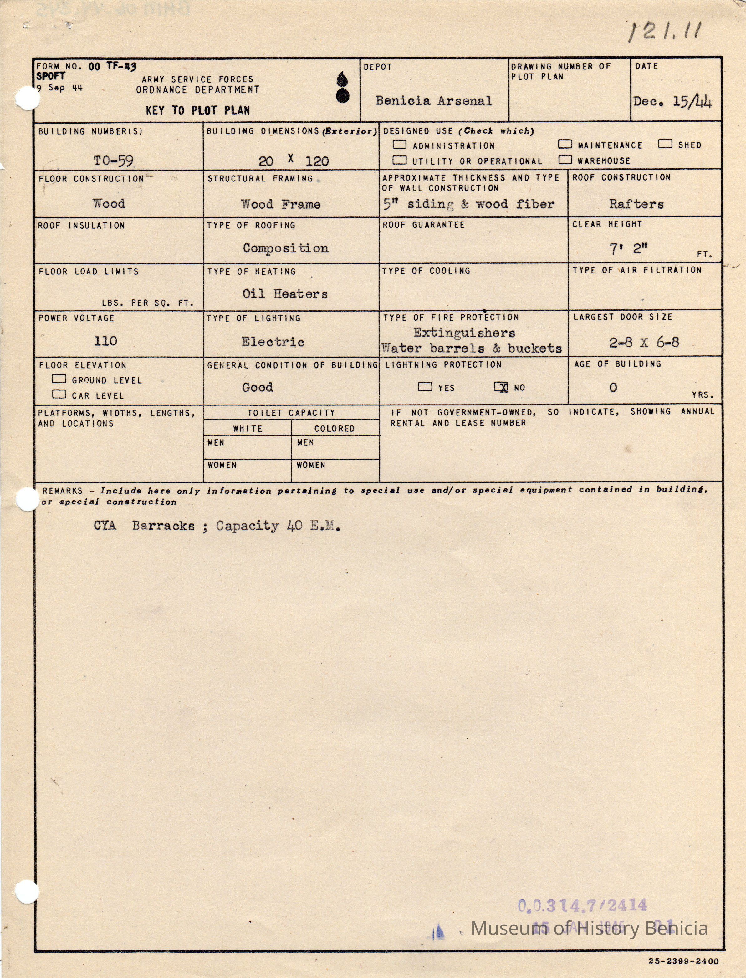 Benicia Arsenal Document. Form No. OO TF-43 SPOFT dated Dec. 15, 1944 Army Service Forces Ordnance Department, Key to Plot Plan Building TO-59 Barracks, CYA, Capacity 40 E. M.