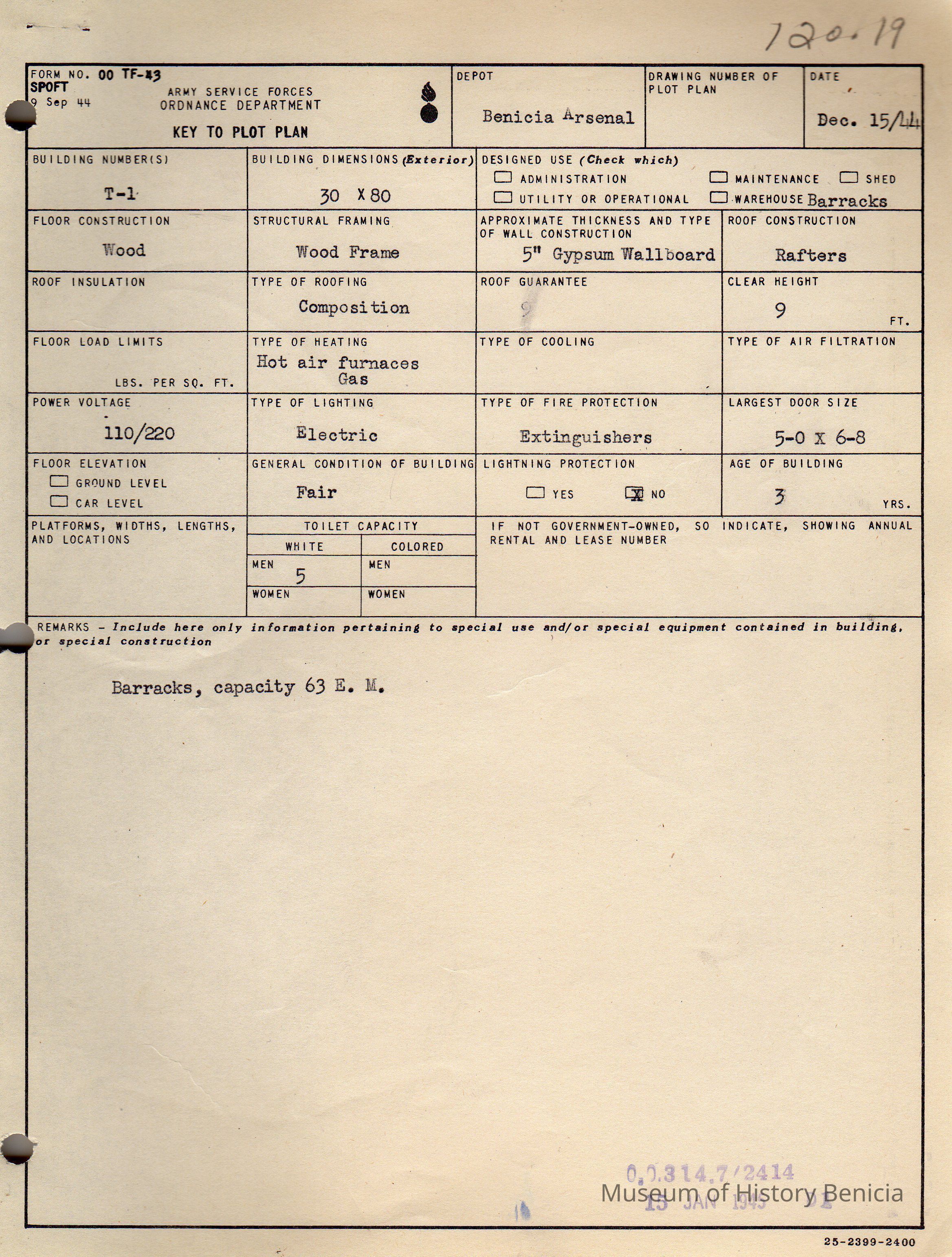 Benicia Arsenal Document. Form No. OO TF-43 SPOFT dated Dec. 15, 1944 Army Service Forces Ordnance Department, Key to Plot Plan Building T-1 Barracks.Collection