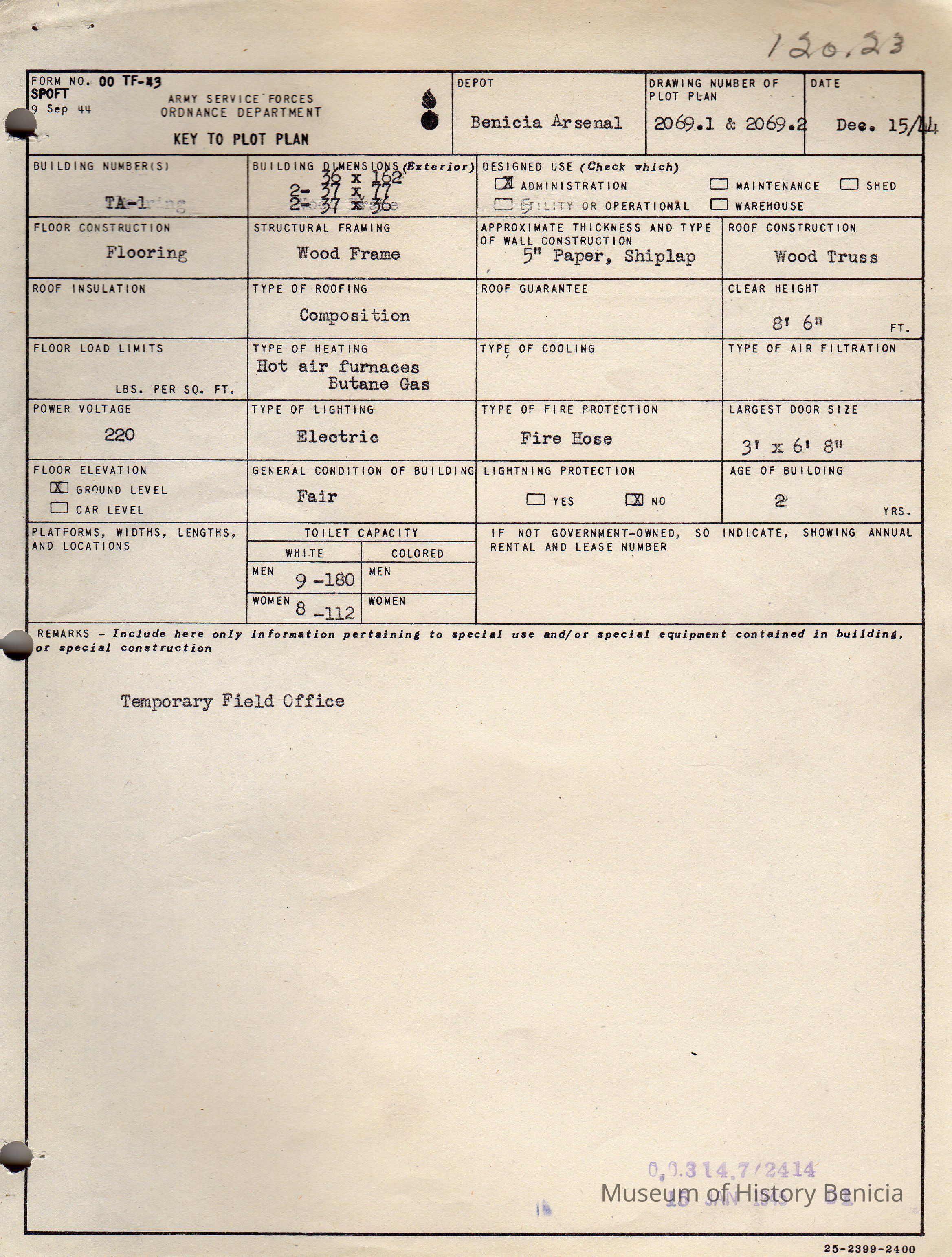 Benicia Arsenal Document. Form No. OO TF-43 SPOFT dated Dec. 15, 1944 Army Service Forces Ordnance Department, Key to Plot Plan Building TA-1 Temperary Field Office.Collection