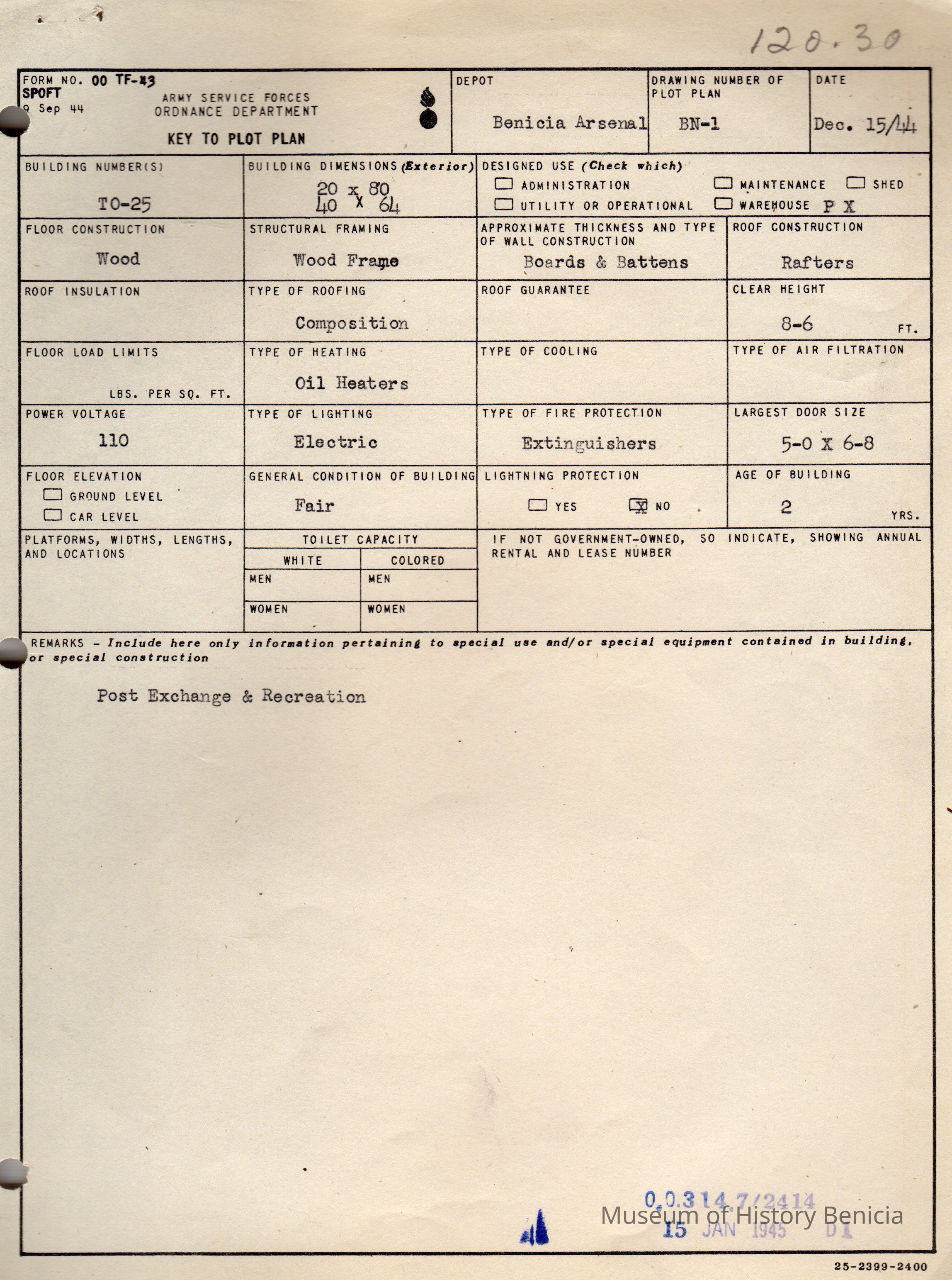 Benicia Arsenal Document. Form No. OO TF-43 SPOFT dated Dec. 15, 1944 Army Service Forces Ordnance Department, Key to Plot Plan Building TO-25.Collection