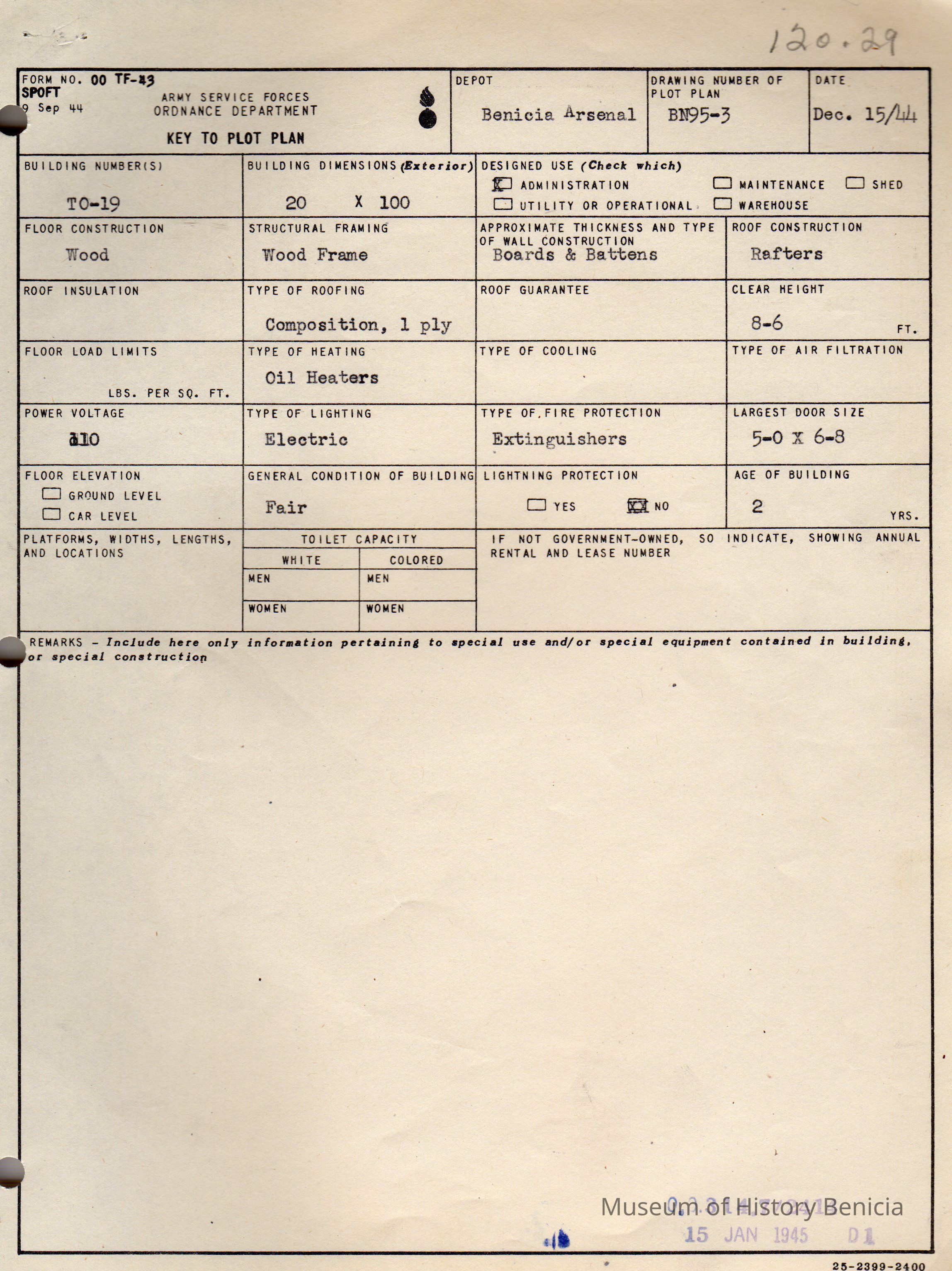 Benicia Arsenal Document. Form No. OO TF-43 SPOFT dated Dec. 15, 1944 Army Service Forces Ordnance Department, Key to Plot Plan Building TO-19.Collection