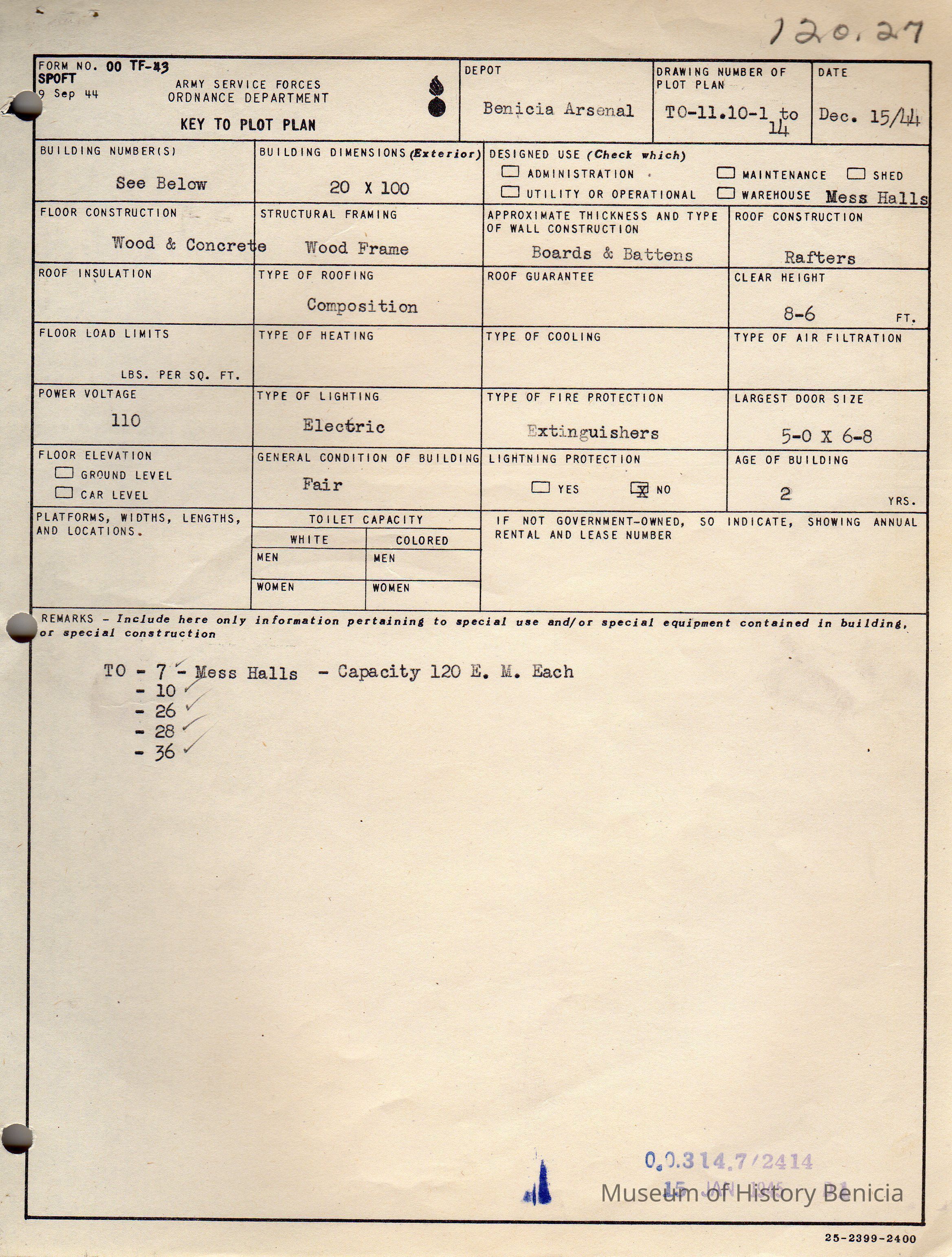 Benicia Arsenal Document. Form No. OO TF-43 SPOFT dated Dec. 15, 1944 Army Service Forces Ordnance Department, Key to Plot Plan Building TO-7, 10, 26, 28, 36.Collection