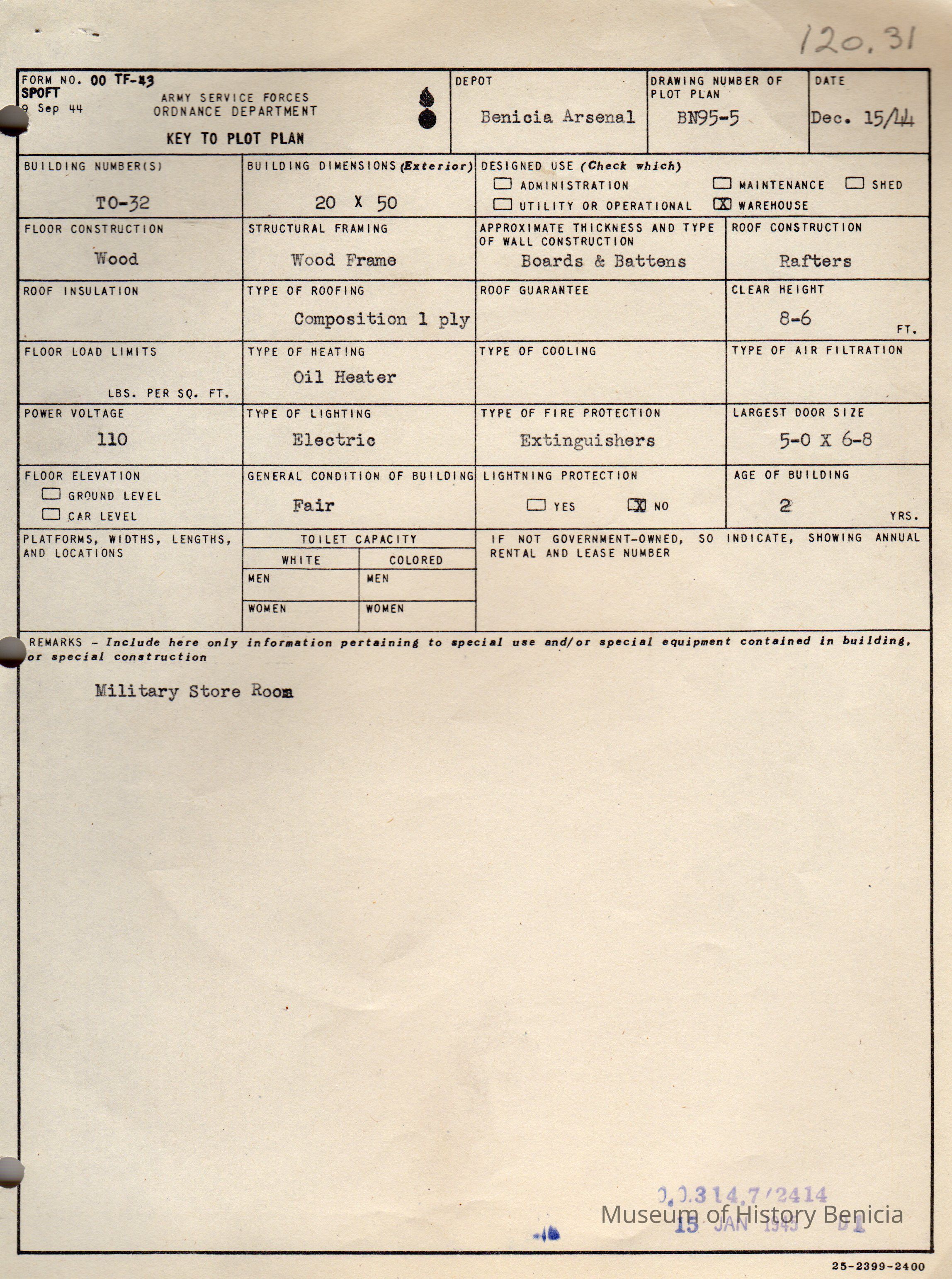 Benicia Arsenal Document. Form No. OO TF-43 SPOFT dated Dec. 15, 1944 Army Service Forces Ordnance Department, Key to Plot Plan Building TO-32 Military Store Room.Collection