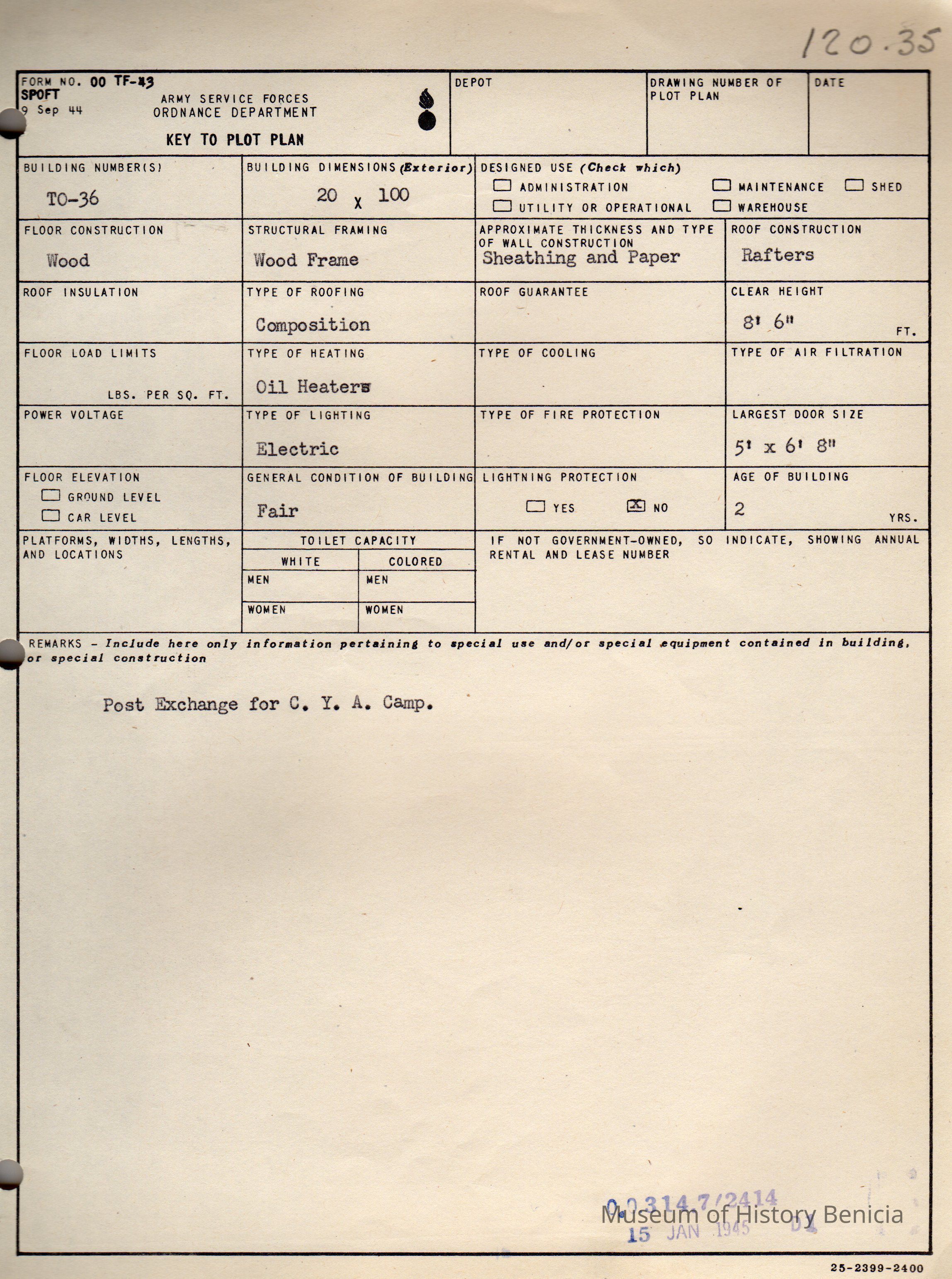 Benicia Arsenal Document. Form No. OO TF-43 SPOFT dated Dec. 15, 1944 Army Service Forces Ordnance Department, Key to Plot Plan Building TO-36 Post Exchange for C.Y.A. Camp.Collection