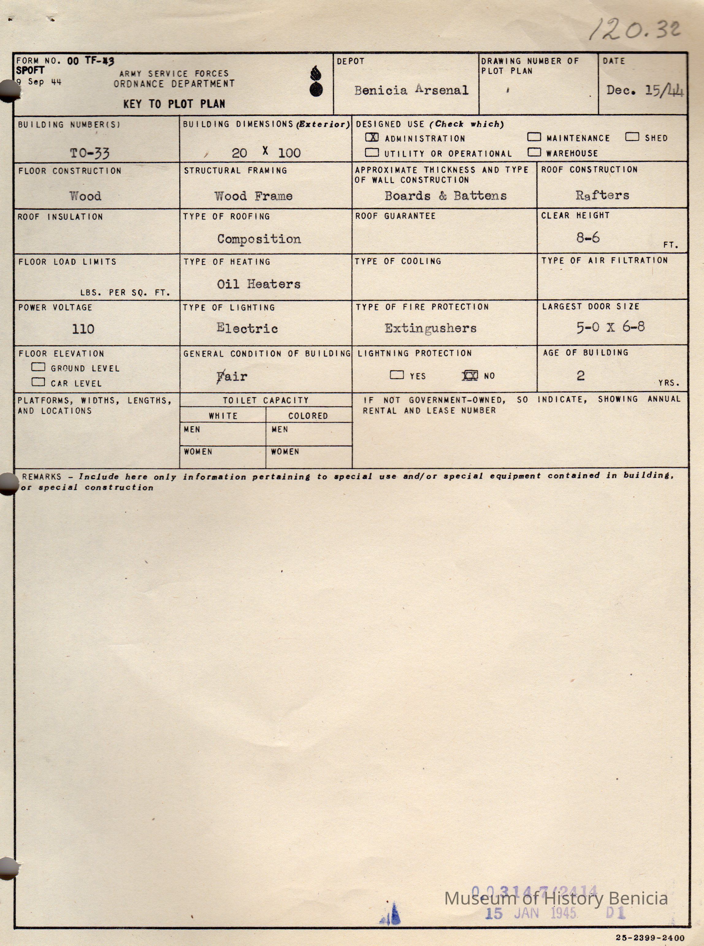 Benicia Arsenal Document. Form No. OO TF-43 SPOFT dated Dec. 15, 1944 Army Service Forces Ordnance Department, Key to Plot Plan Building TO-33.Collection