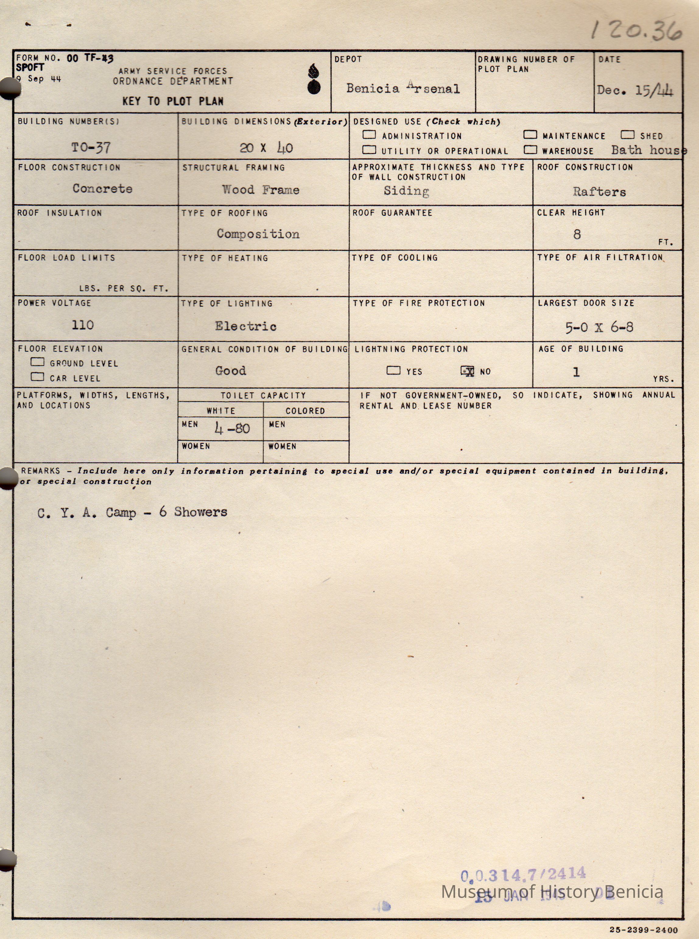 Benicia Arsenal Document. Form No. OO TF-43 SPOFT dated Dec. 15, 1944 Army Service Forces Ordnance Department, Key to Plot Plan Building TO-37 C.Y.A. Camp -- 6 showers.Collection
