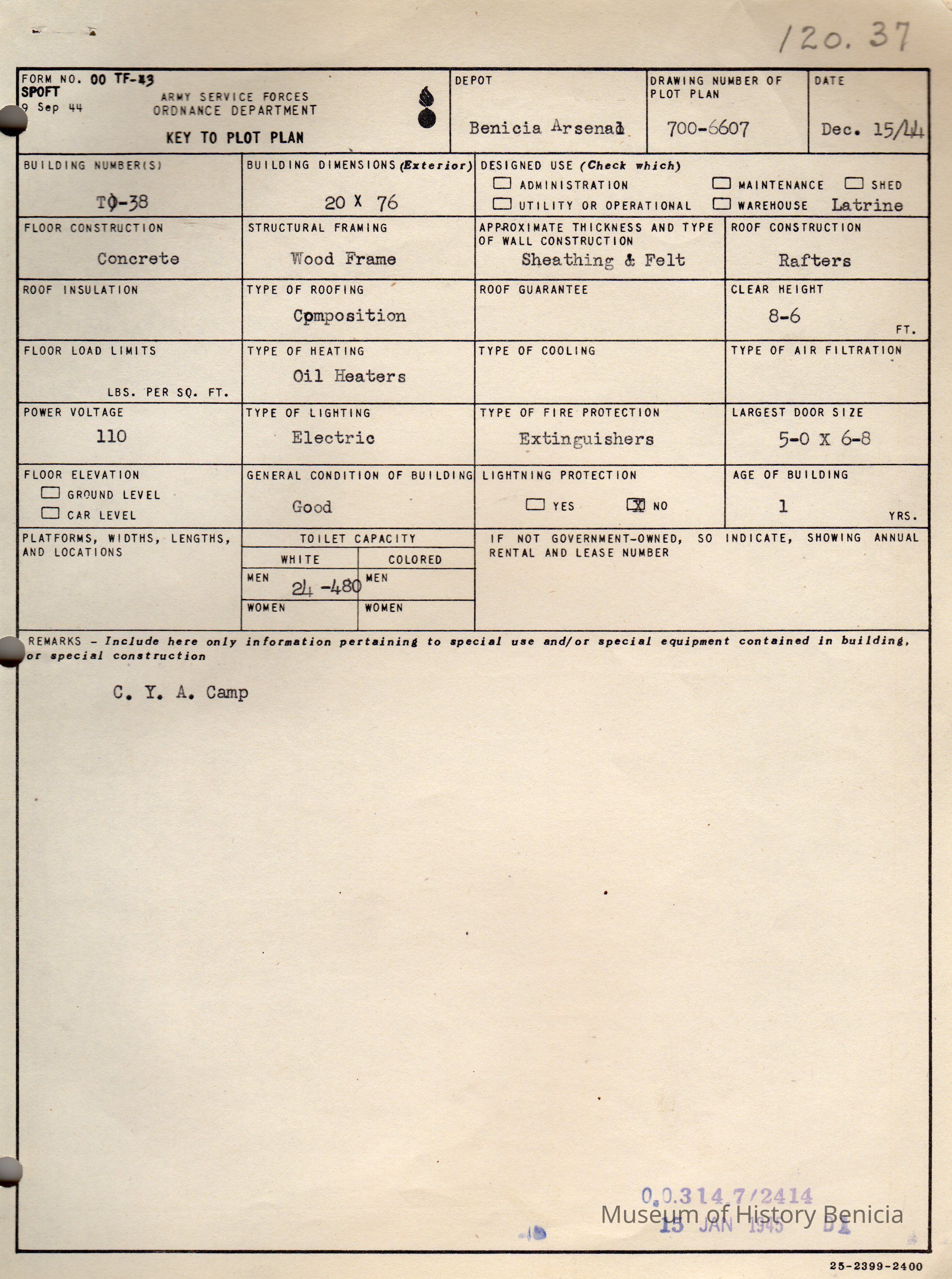 Benicia Arsenal Document. Form No. OO TF-43 SPOFT dated Dec. 15, 1944 Army Service Forces Ordnance Department, Key to Plot Plan Building TO-38 C.Y.A. Camp.Collection
