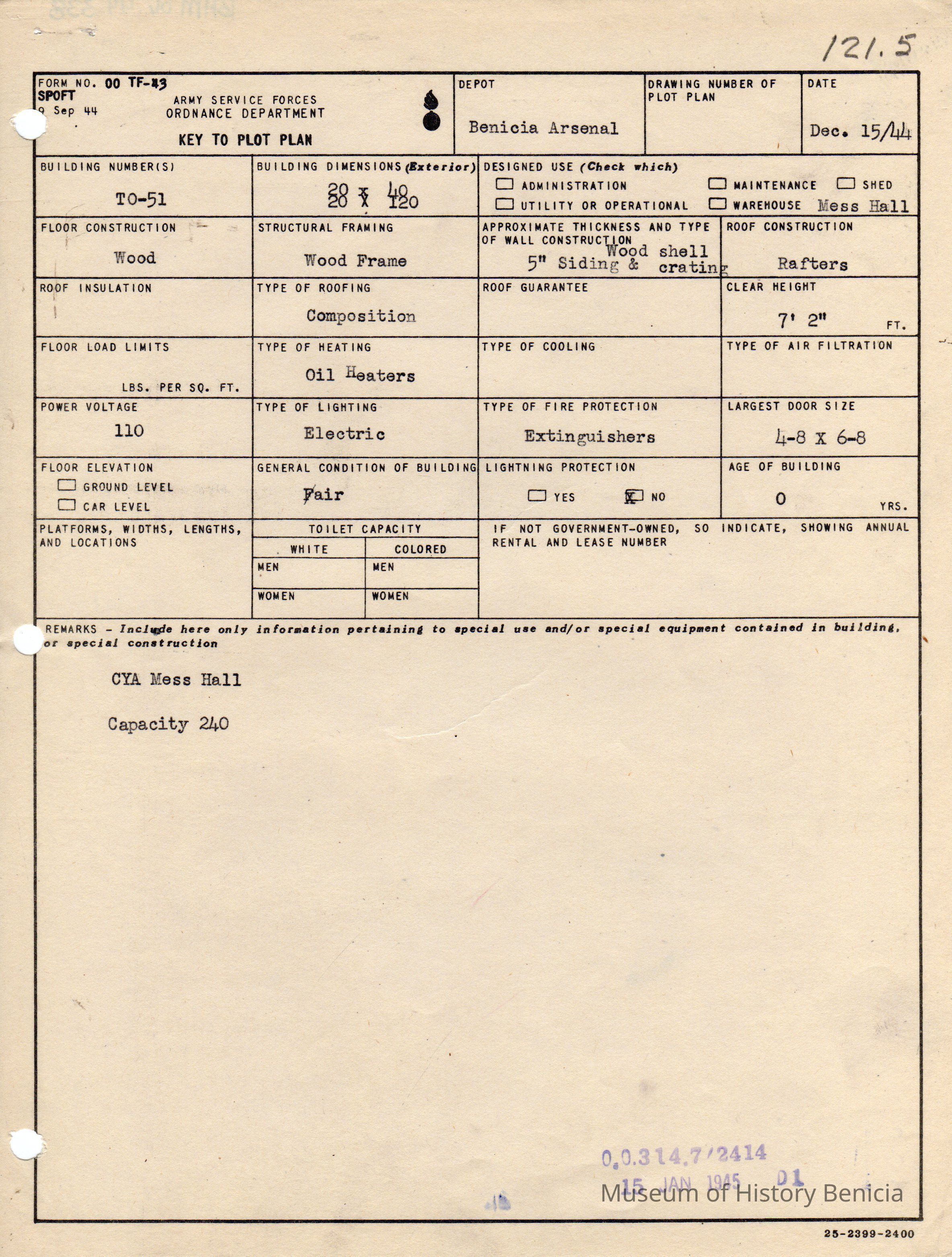 Benicia Arsenal Document. Form No. OO TF-43 SPOFT dated Dec. 15, 1944 Army Service Forces Ordnance Department, Key to Plot Plan Building TO-51 CYA Mess Hall