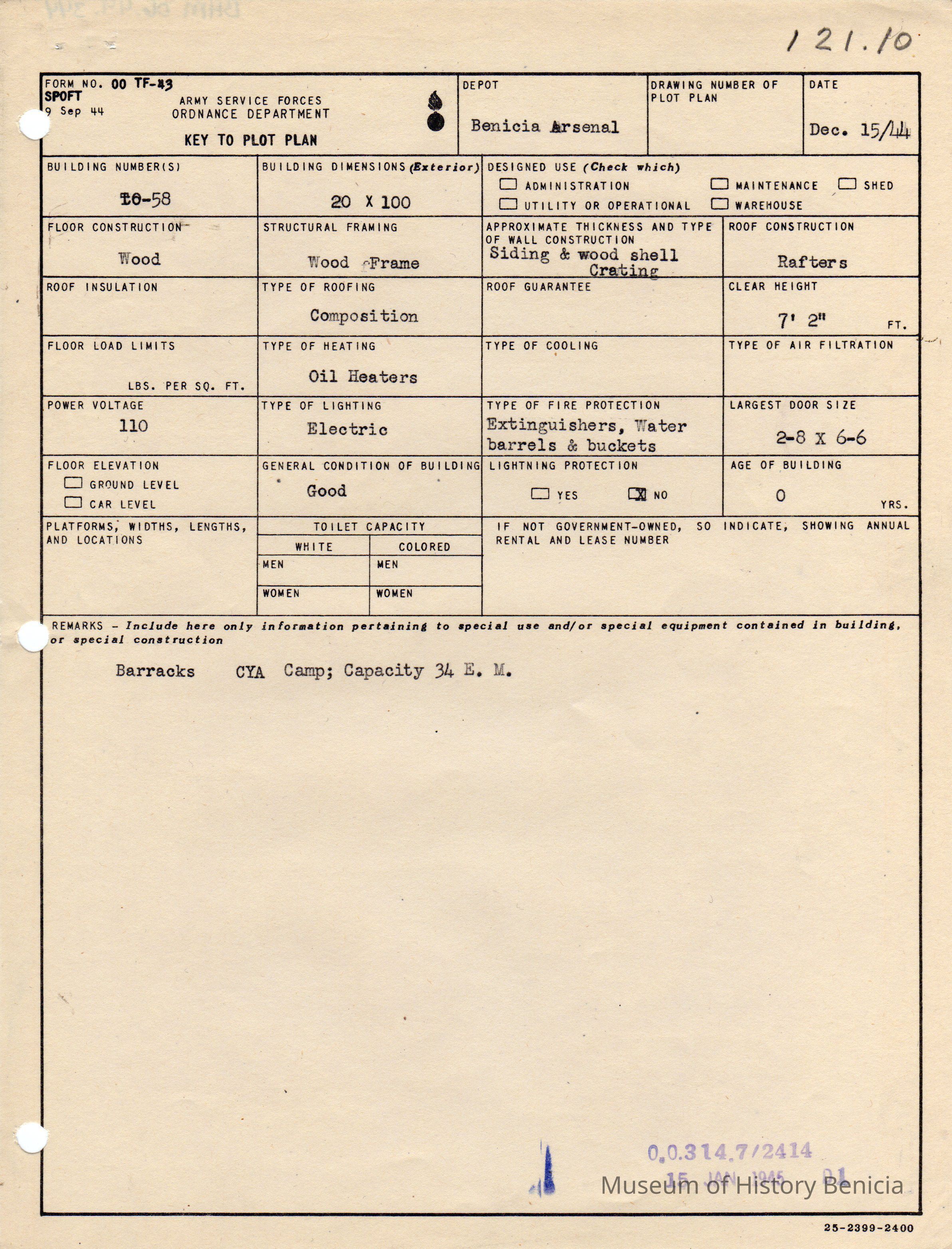 Benicia Arsenal Document. Form No. OO TF-43 SPOFT dated Dec. 15, 1944 Army Service Forces Ordnance Department, Key to Plot Plan Building TO-58 Barracks, CYA Camp, Capacity 34 E. M.
