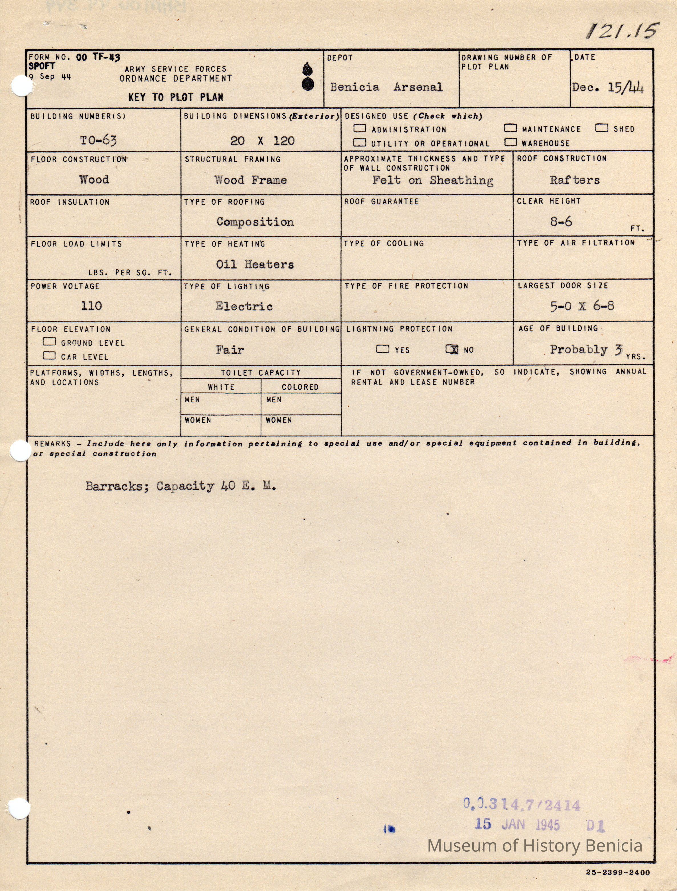 Benicia Arsenal Document. Form No. OO TF-43 SPOFT dated Dec. 15, 1944 Army Service Forces Ordnance Department, Key to Plot Plan Building TO-63 Barracks, Capacity 40 E. M.