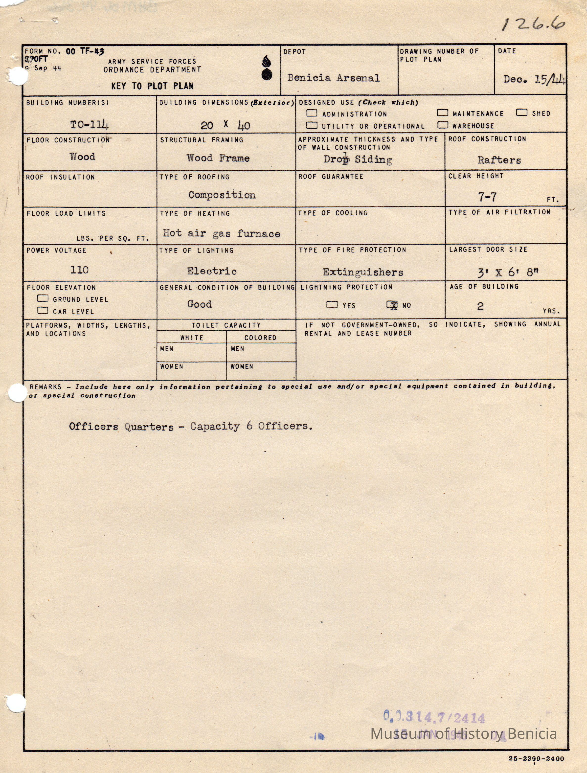 Benicia Arsenal Document. Form No. OO TF-43 SPOFT dated Dec. 15, 1944 Army Service Forces Ordnance Department, Key to Plot Plan Building TO-114 Officers Quarters capacity 6 Officers"15 JAN 1945"Collection