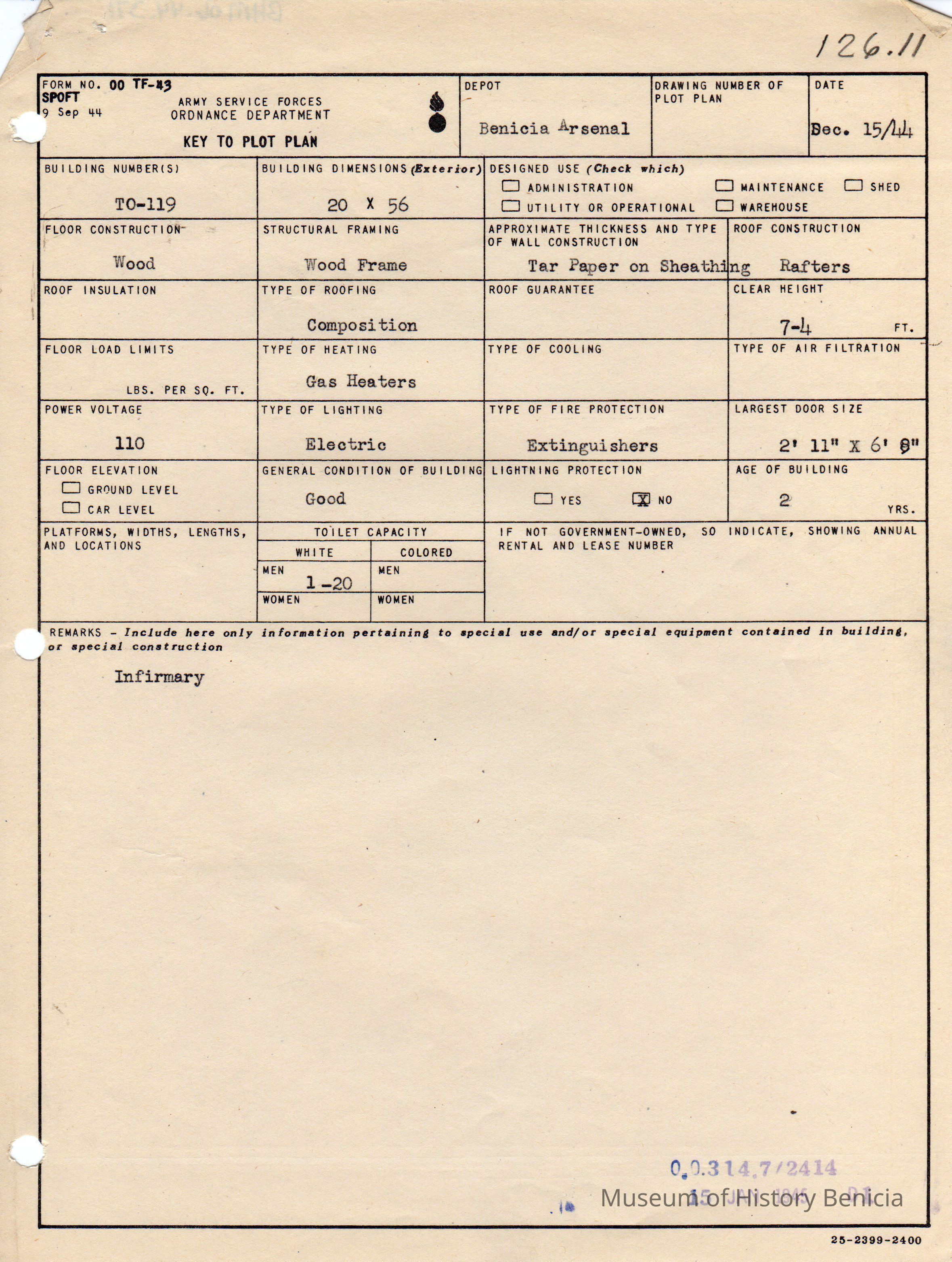 Benicia Arsenal Document. Form No. OO TF-43 SPOFT dated Dec. 15, 1944 Army Service Forces Ordnance Department, Key to Plot Plan Building TO-119 Infirmary"15 JAN 1945"Collection
