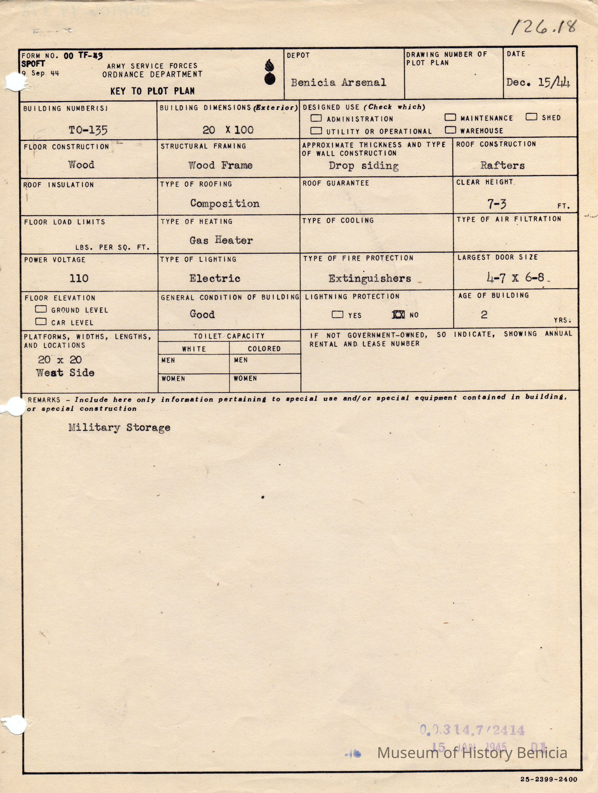 Benicia Arsenal Document. Form No. OO TF-43 SPOFT dated Dec. 15, 1944 Army Service Forces Ordnance Department, Key to Plot Plan Building TO-135 Military Storage"15 JAN 1945"Collection