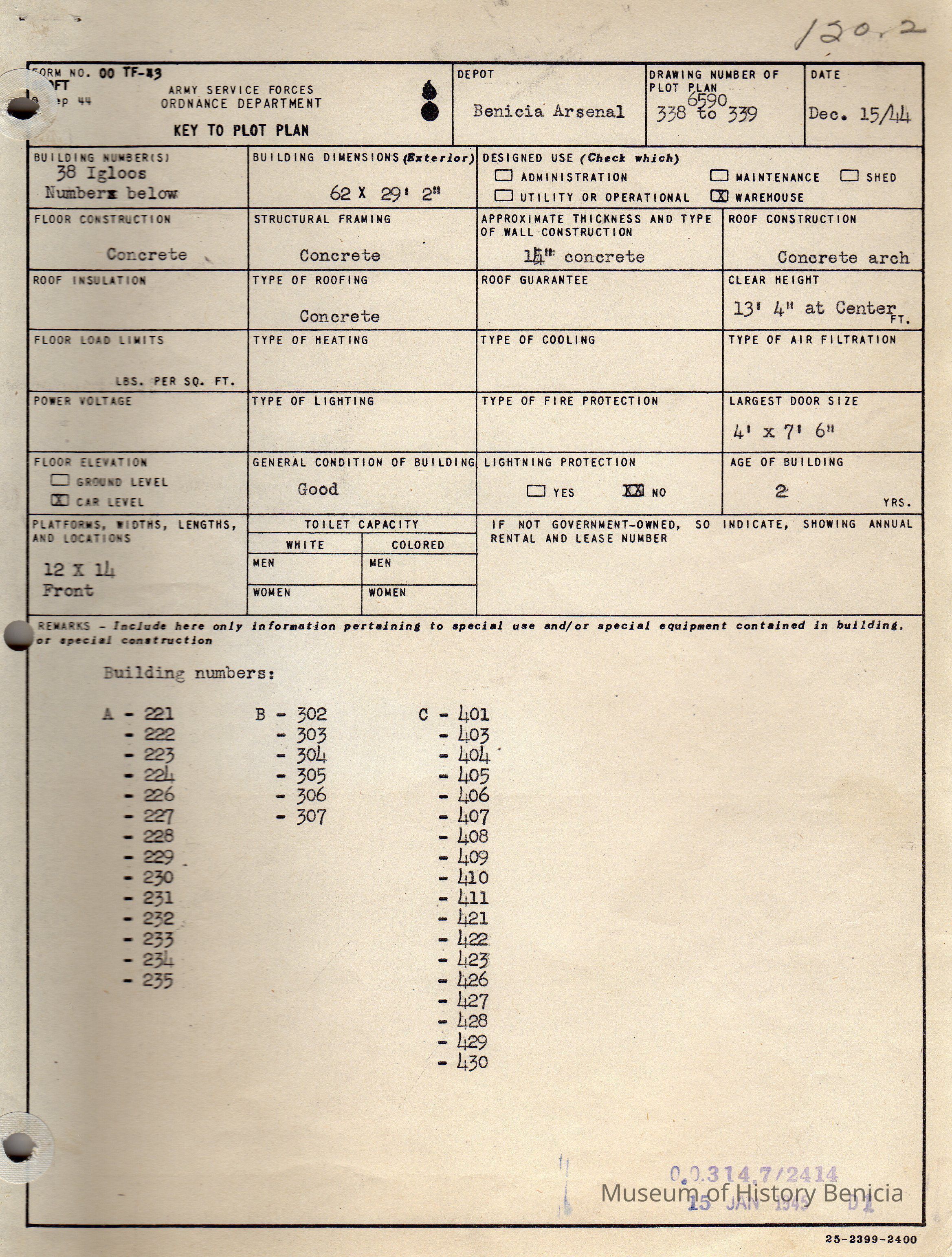 Benicia Arsenal Document. Form No. OO TF-43 SPOFT dated Dec. 15, 1944 Army Service Forces Ordnance Department, Key to Plot Plan, 38 Igloos.Collection