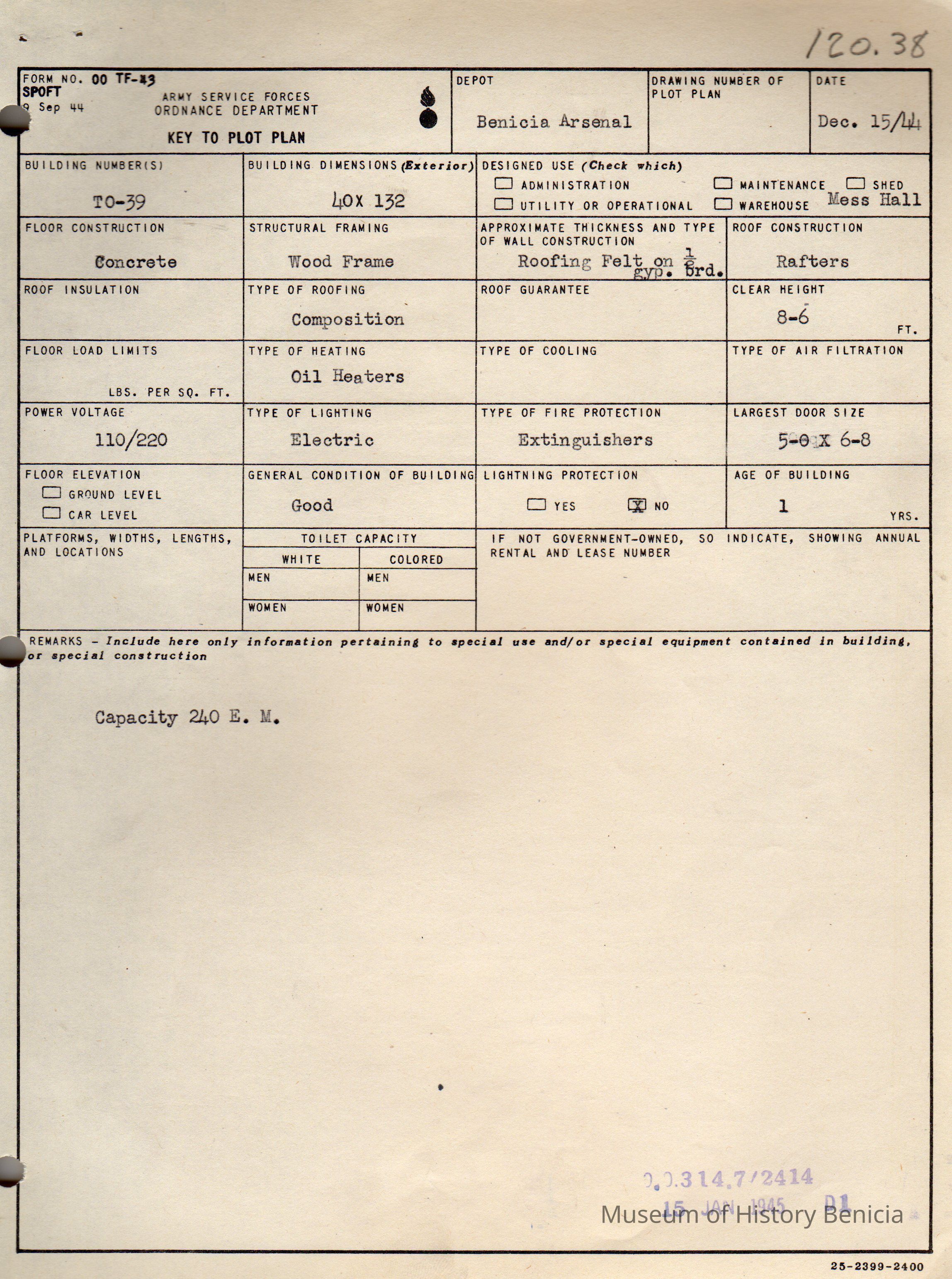 Benicia Arsenal Document. Form No. OO TF-43 SPOFT dated Dec. 15, 1944 Army Service Forces Ordnance Department, Key to Plot Plan Building TO-39.Collection