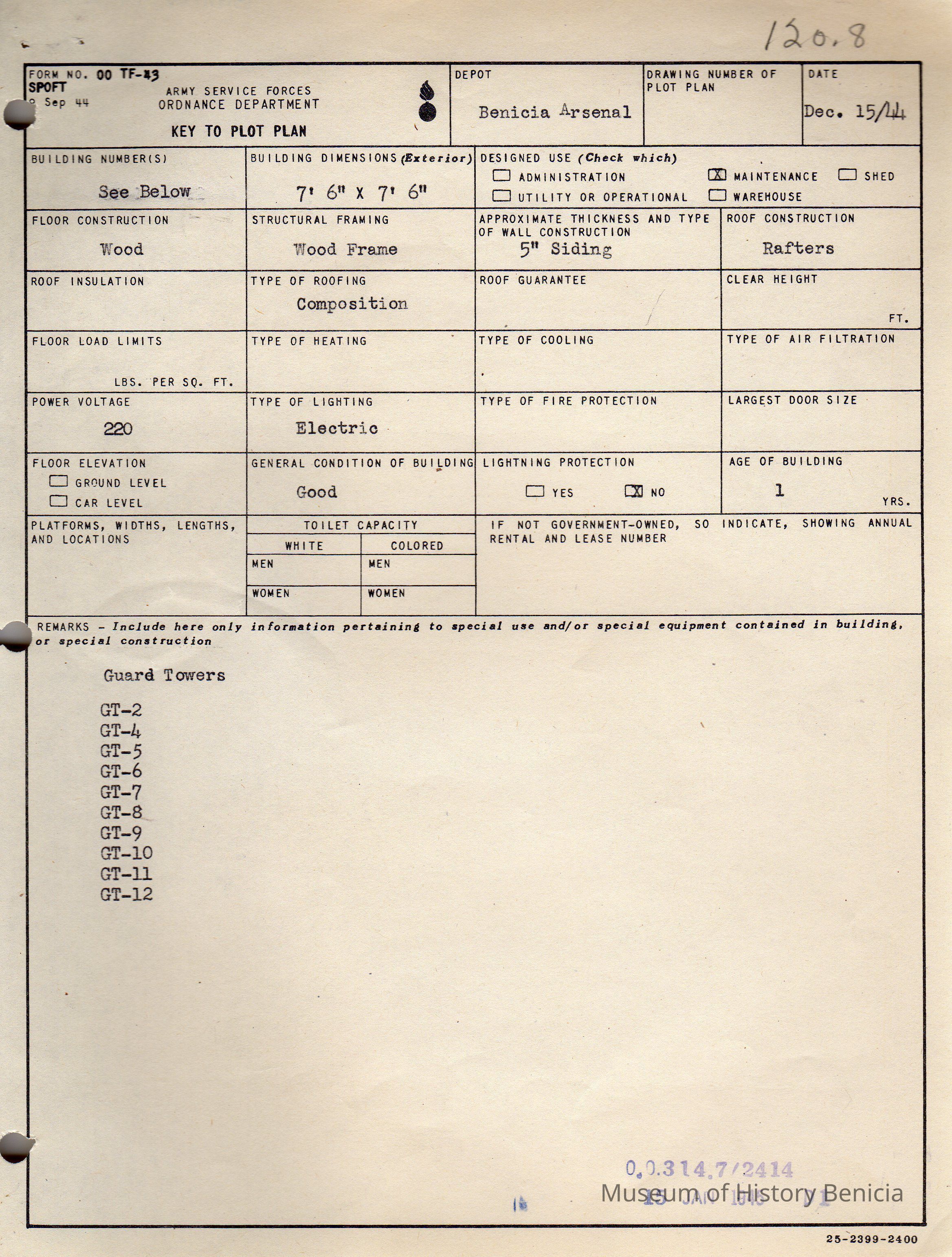 Benicia Arsenal Document. Form No. OO TF-43 SPOFT dated Dec. 15, 1944 Army Service Forces Ordnance Department, Key to Plot Plan for Guard Towers.Collection