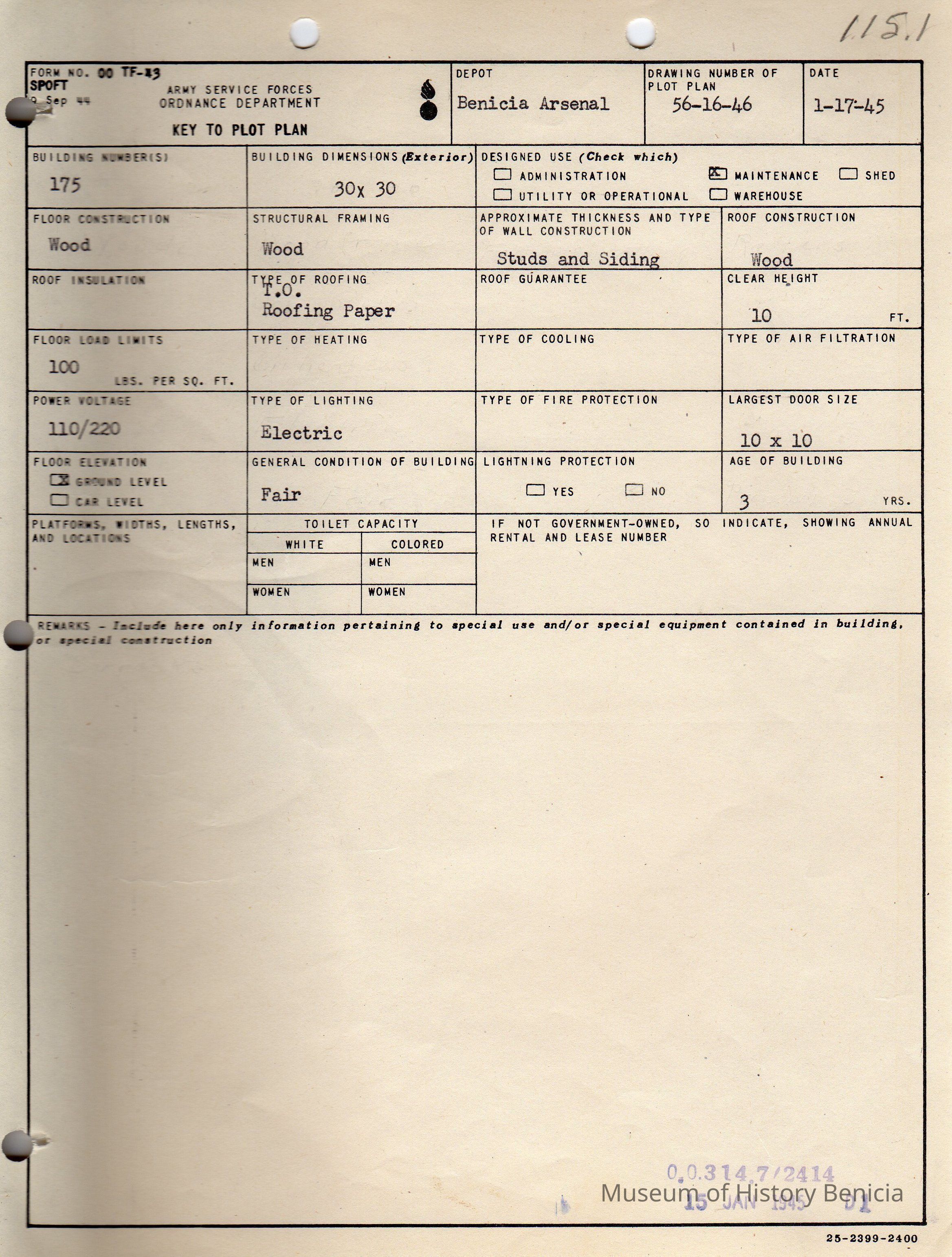 Benicia Arsenal Document. Form No. OO TF-43 SPOFT dated Jan. 17, 1945. Army Service Forces Ordnance Department, Key to Plot Plan, Building 175 Tire Shop.Collection