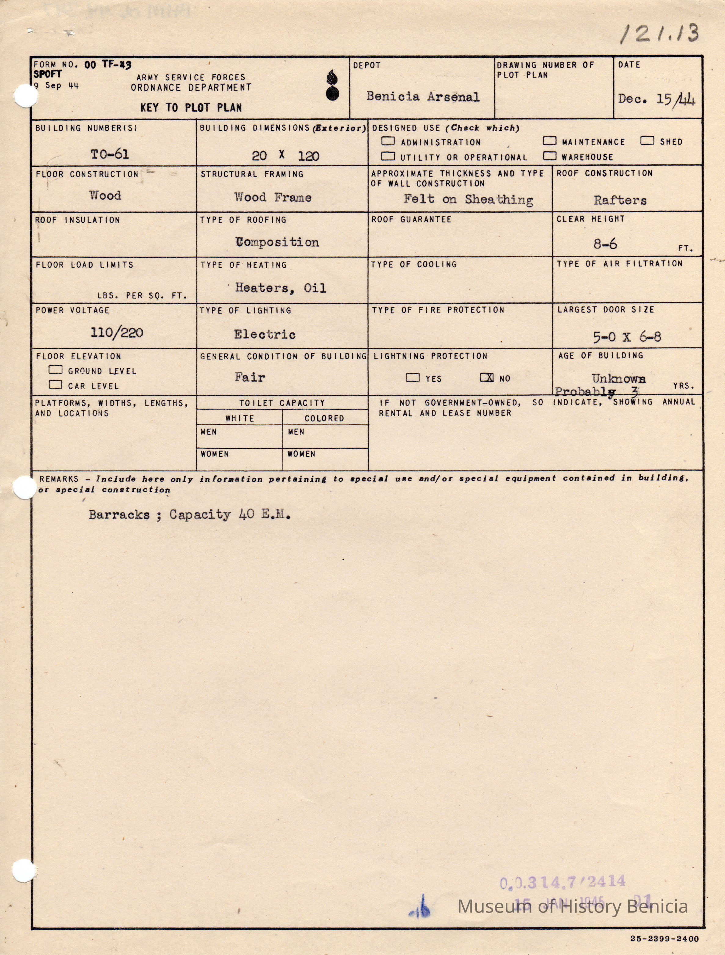 Benicia Arsenal Document. Form No. OO TF-43 SPOFT dated Dec. 15, 1944 Army Service Forces Ordnance Department, Key to Plot Plan Building TO-61 Barracks, Capacity 40 E. M.