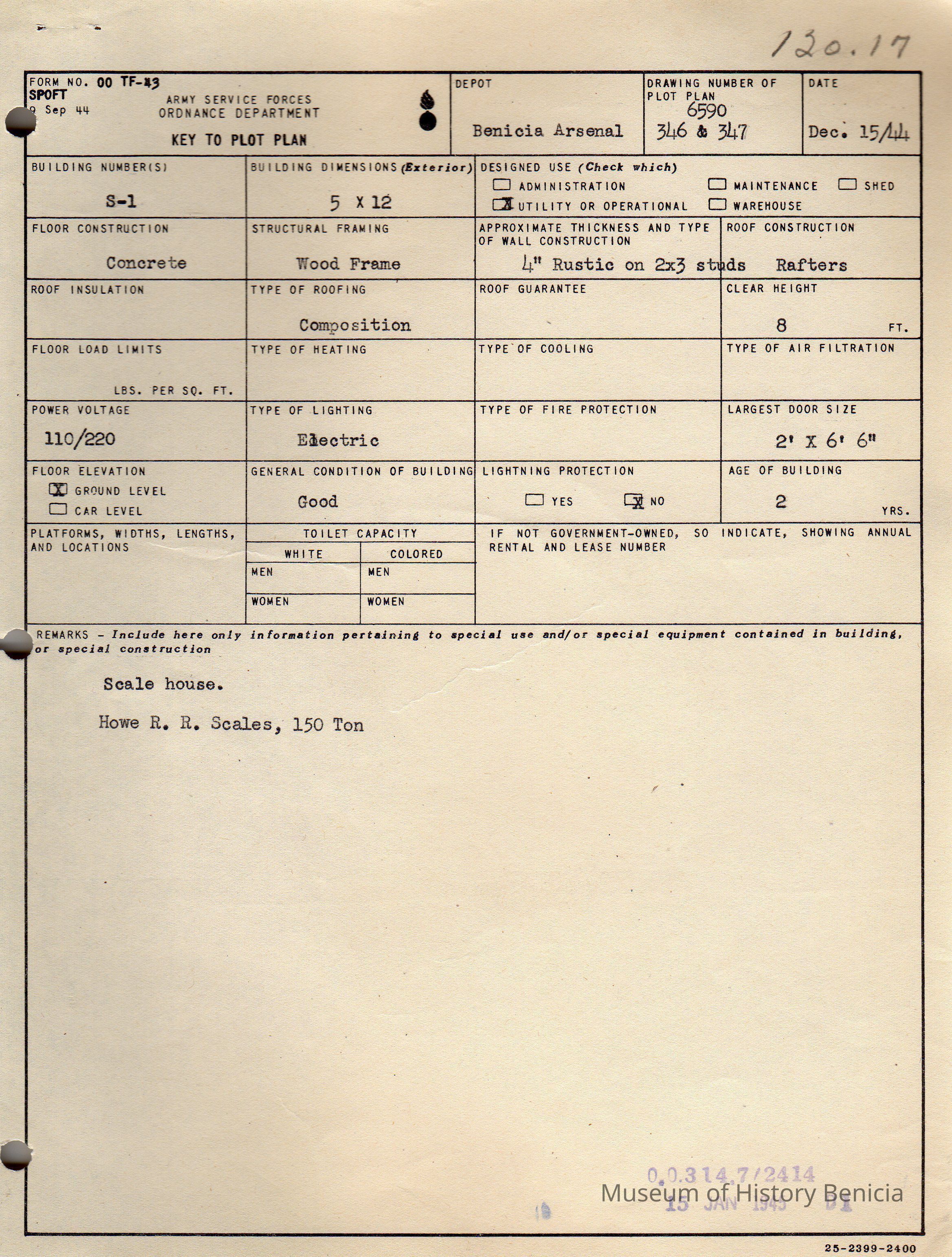 Benicia Arsenal Document. Form No. OO TF-43 SPOFT dated Dec. 15, 1944 Army Service Forces Ordnance Department, Key to Plot Plan Building S-1 Scale House.Collection
