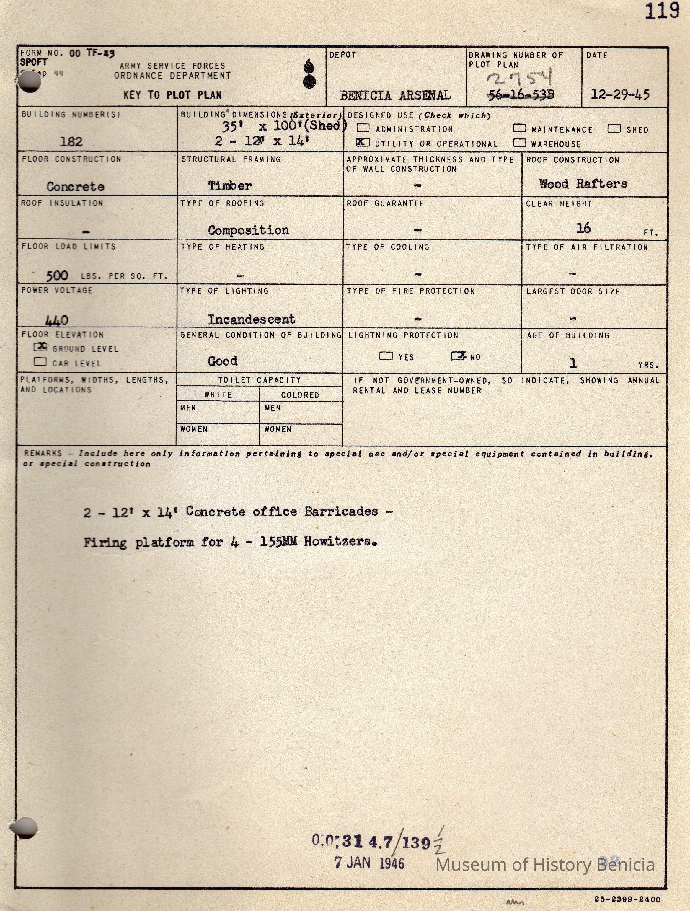 Benicia Arsenal Document. Form No. OO TF-43 SPOFT dated Dec. 29, 1945. Army Service Forces Ordnance Department, Key to Plot Plan, Building 182.Collection