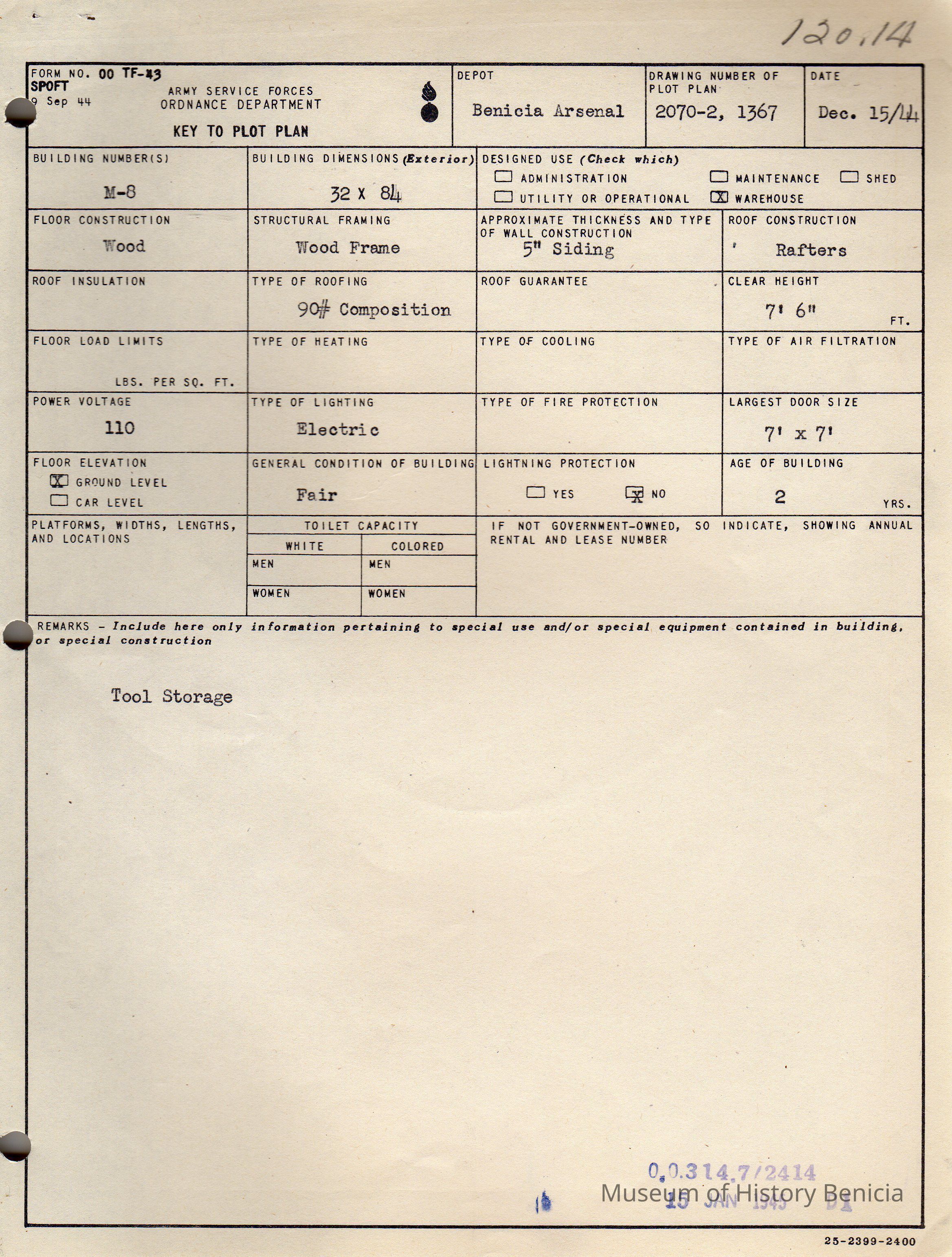 Benicia Arsenal Document. Form No. OO TF-43 SPOFT Army Service Forces Ordnance Department, Key to Plot Plan Building M-8 Tool Storage.Collection