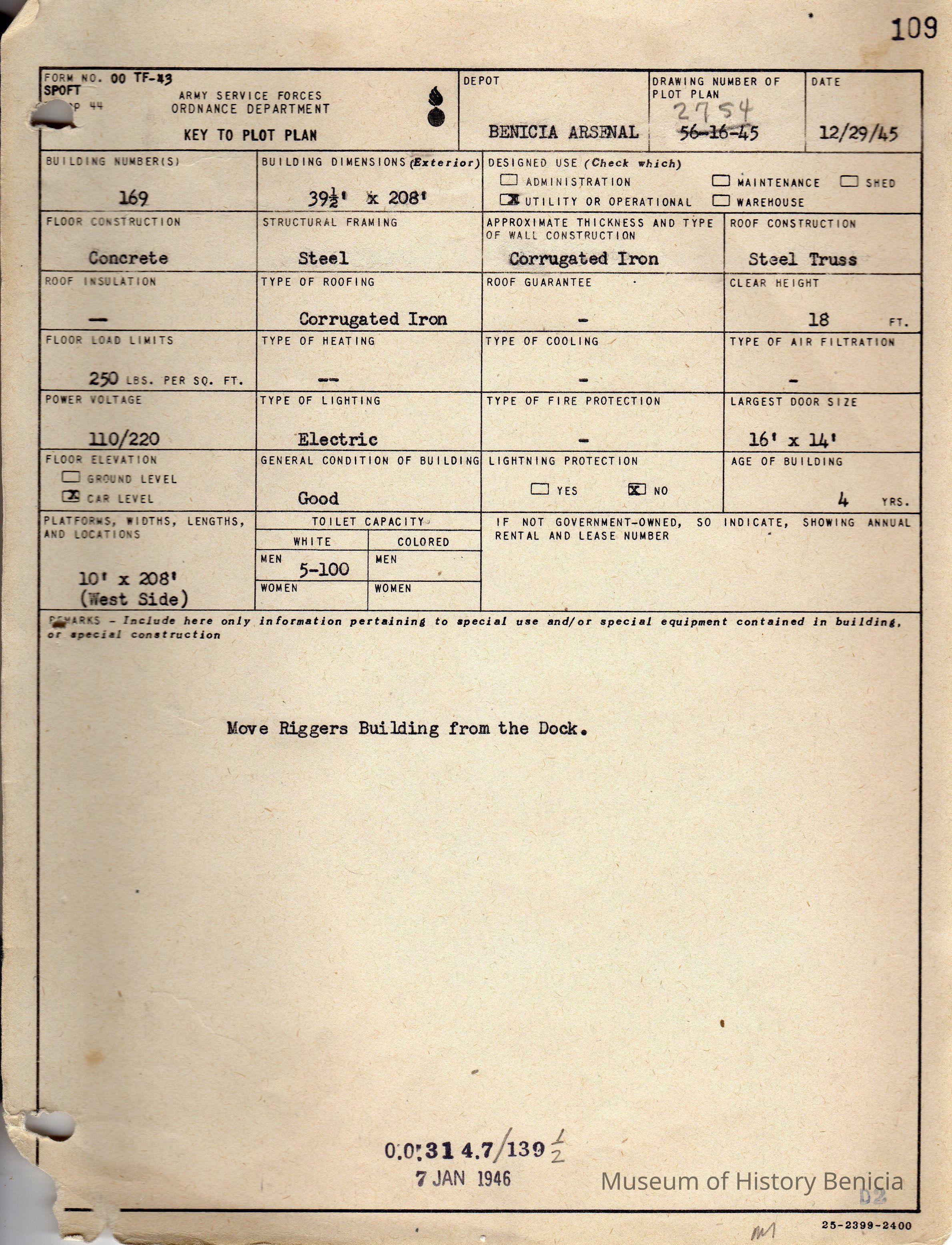 Benicia Arsenal Document. Form No. OO TF-43 SPOFT dated Dec. 29, 1945. Army Service Forces Ordnance Department, Key to Plot Plan, Building 169.Collection