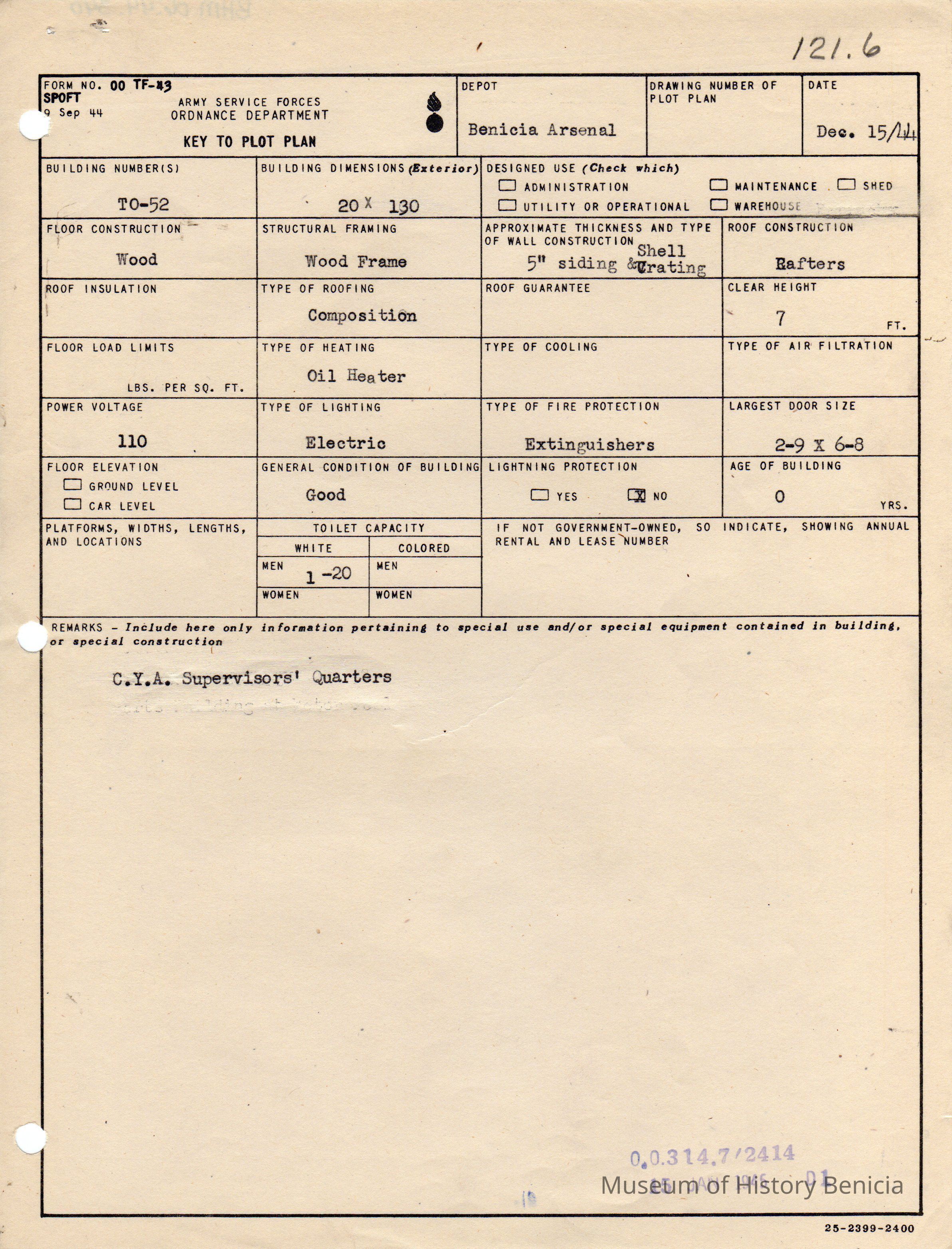 Benicia Arsenal Document. Form No. OO TF-43 SPOFT dated Dec. 15, 1944 Army Service Forces Ordnance Department, Key to Plot Plan Building TO-52 CYA Supervisors' Quarters.
