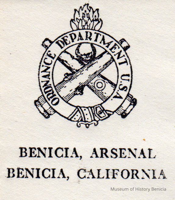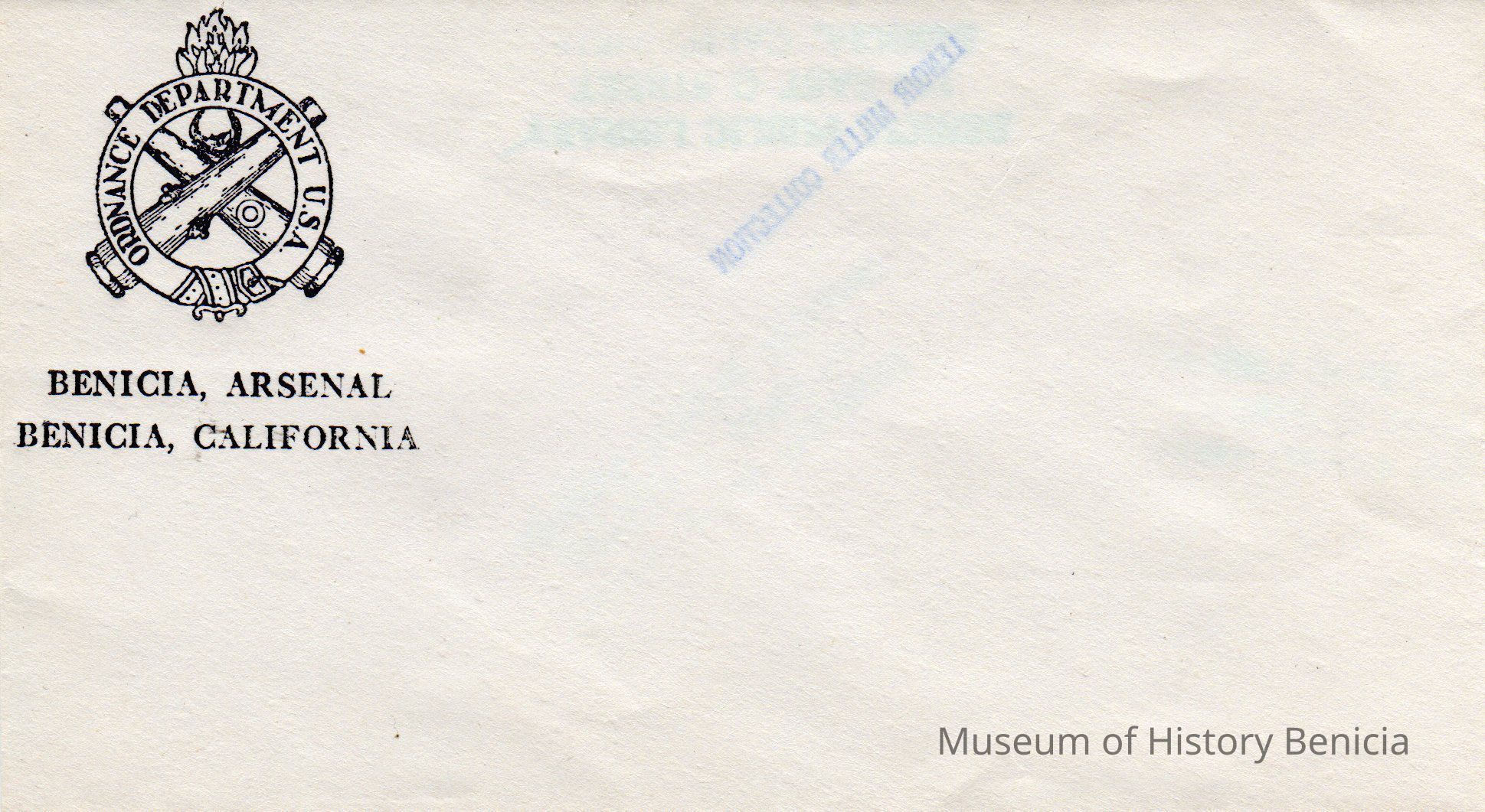 Envelope with Ordnance Department U.S.A. emblem in the top left corner below is printed "Benicia Arsenal Benicia, California