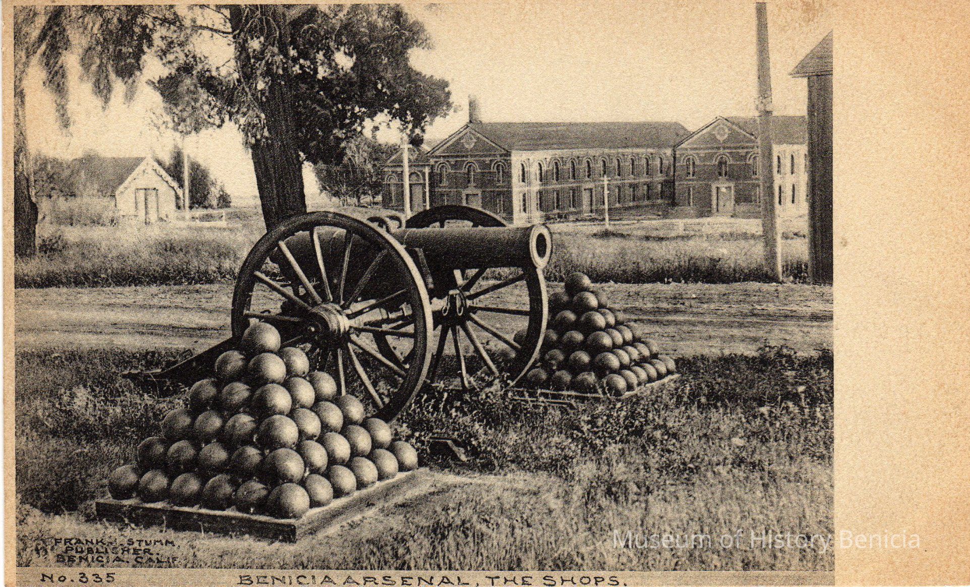B/W image of the Arsenal: machine shops in the background and canon with canon balls in a pyramid formation in the foreground, Benicia, California.Collection