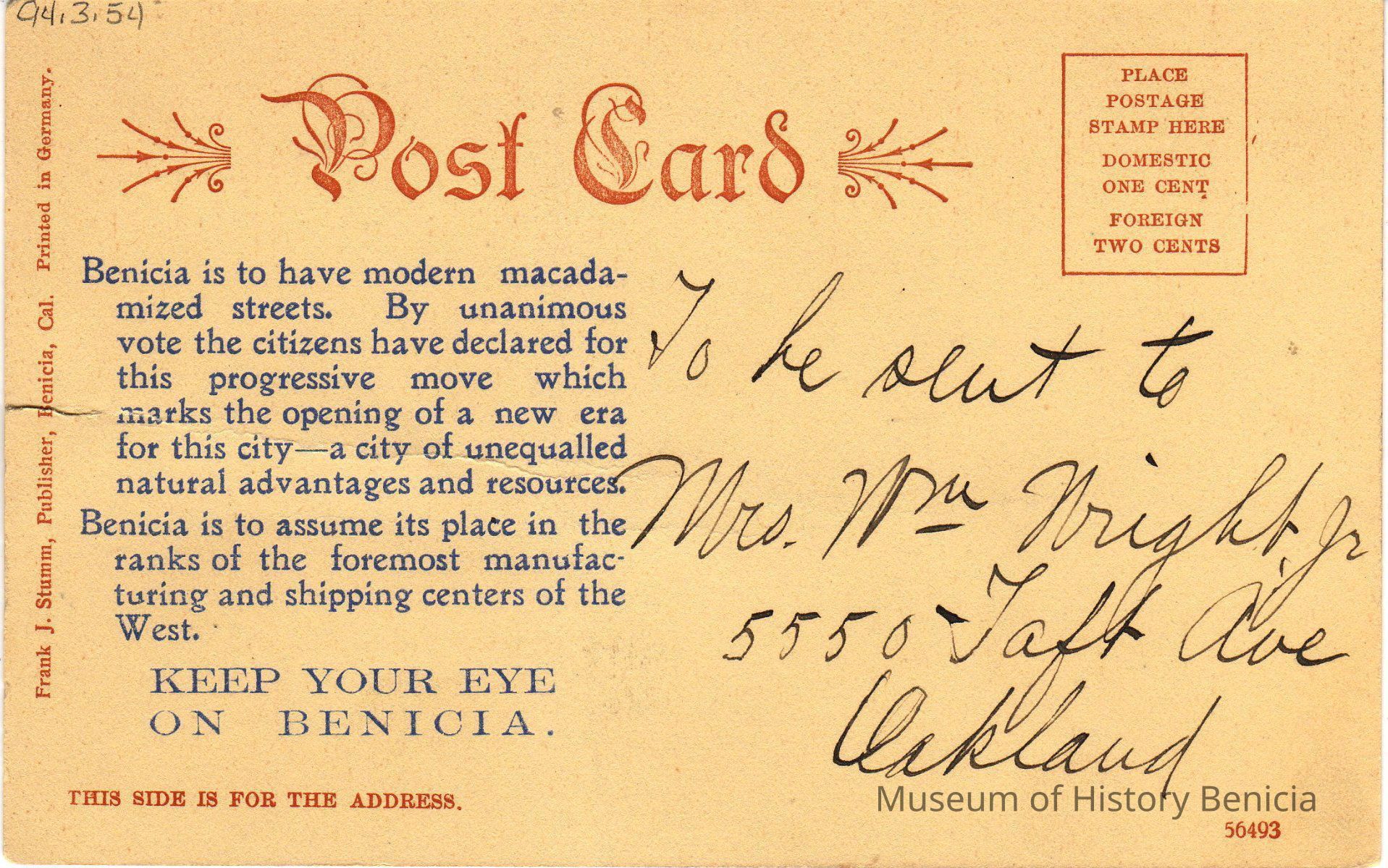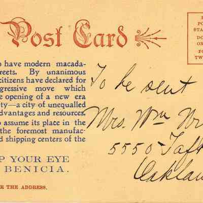 advertisement for Benicia and its "macadamized" streets appears on the back