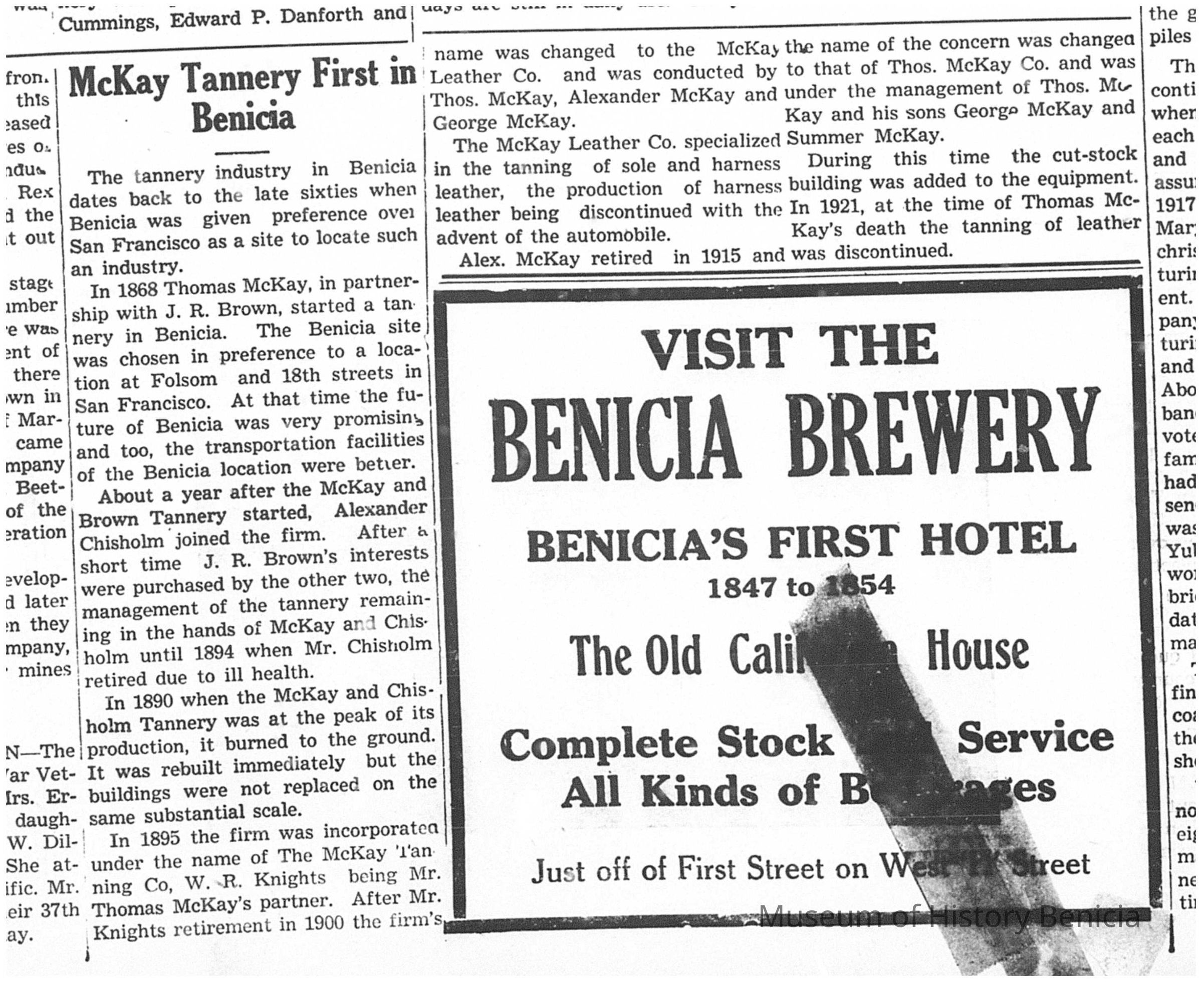Attached is a newspaper article from the Benicia Hearld of 09/09/1937 about the McKay tannery.Collection