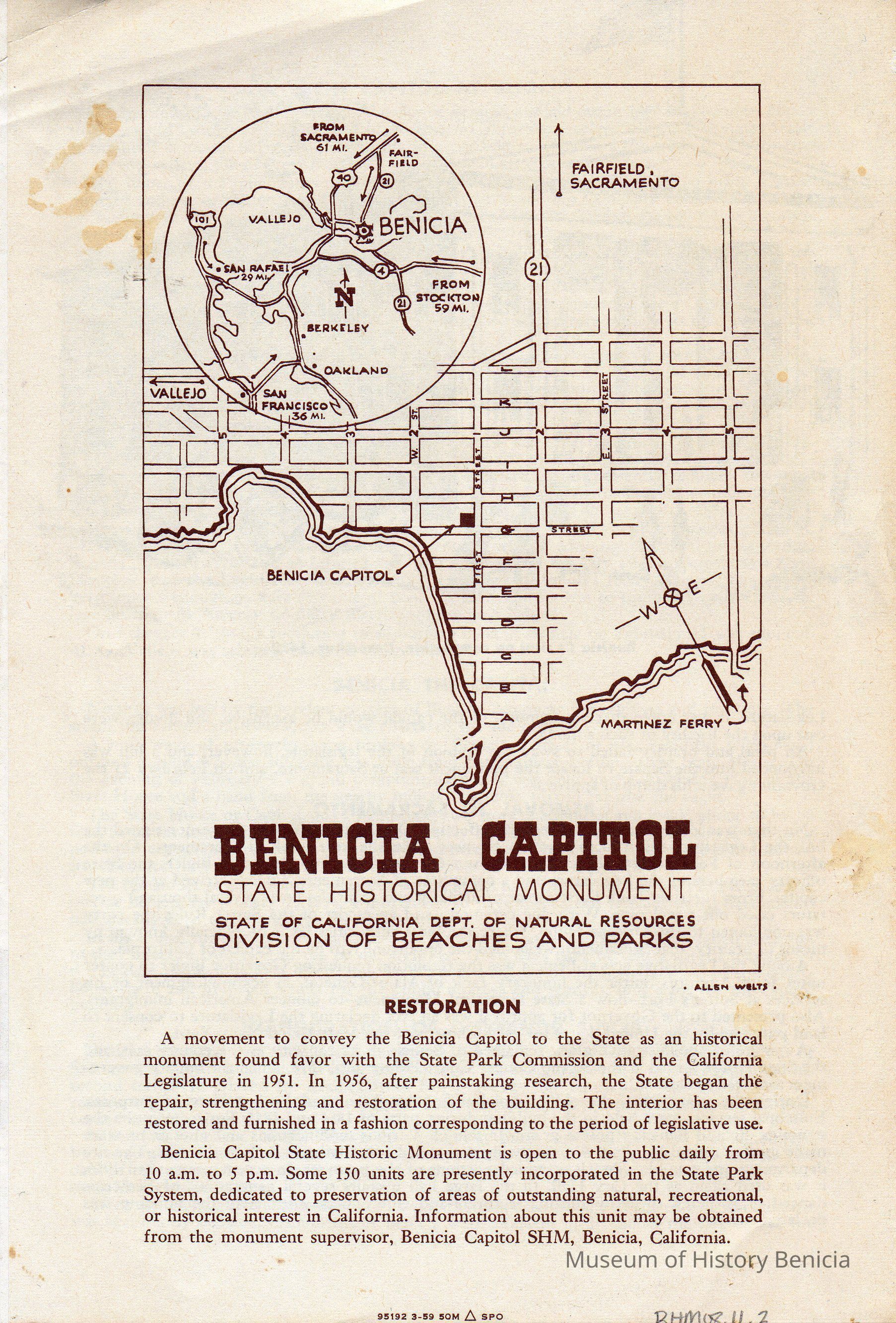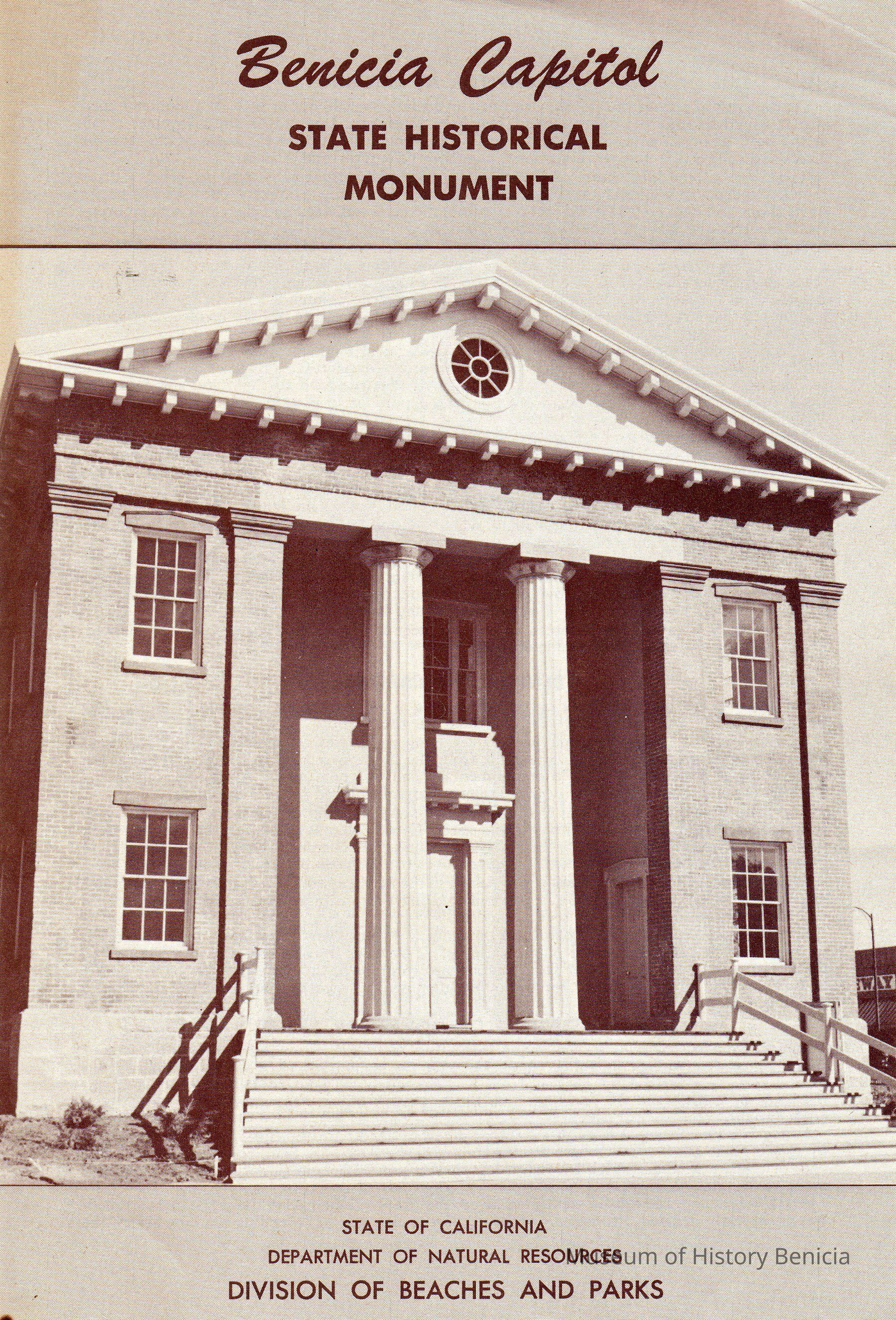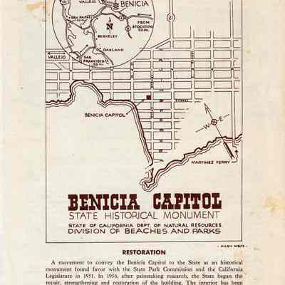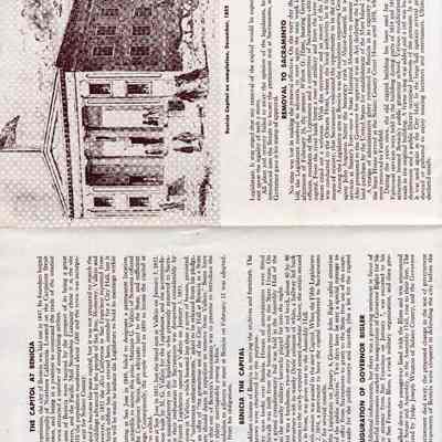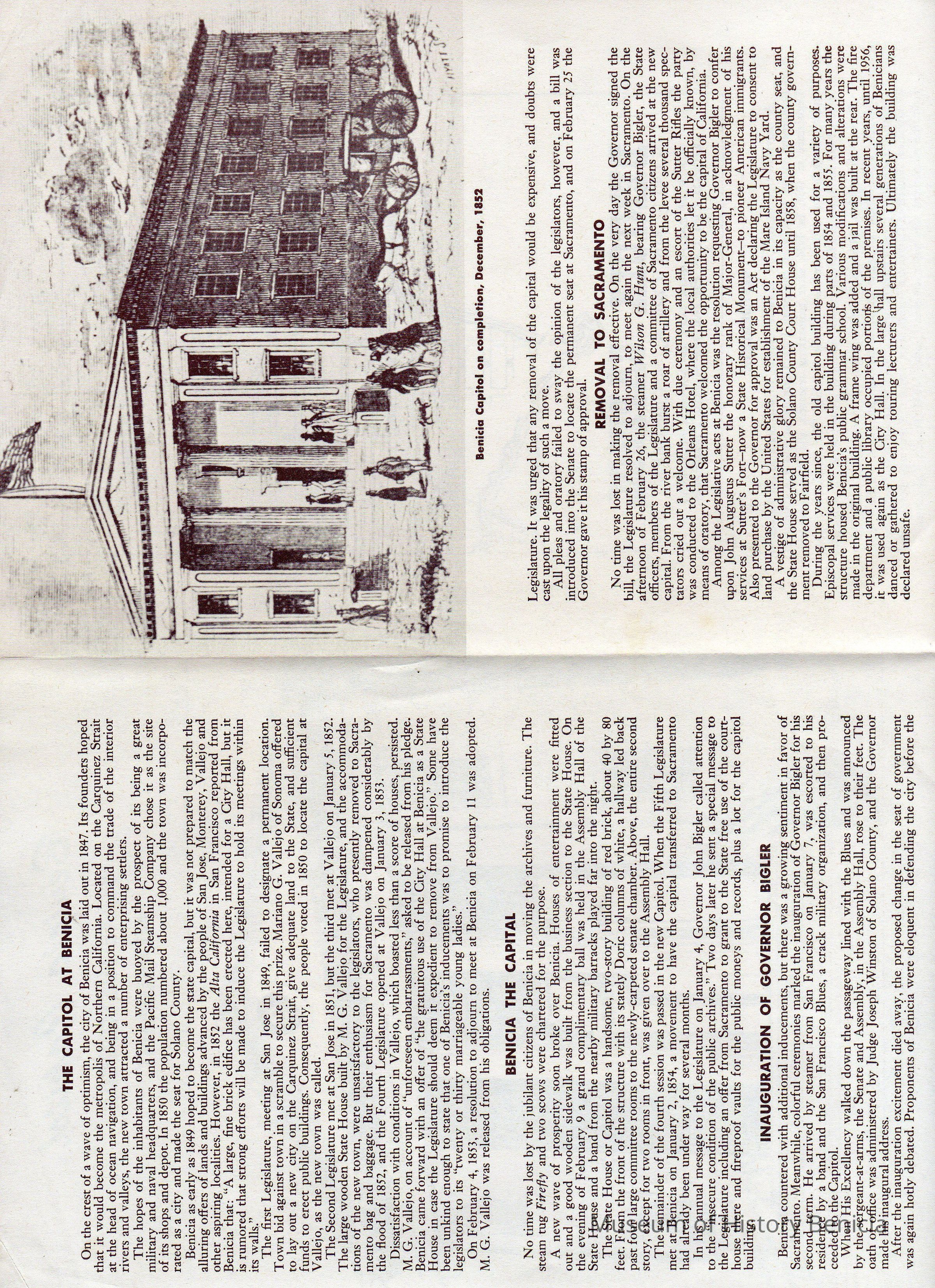 Pamphlet on the Benicia State Capitol State Historical Monument. Inside it has information on the capitol, California Governor at the time John Bigler, and the move to Sacramento.Collection