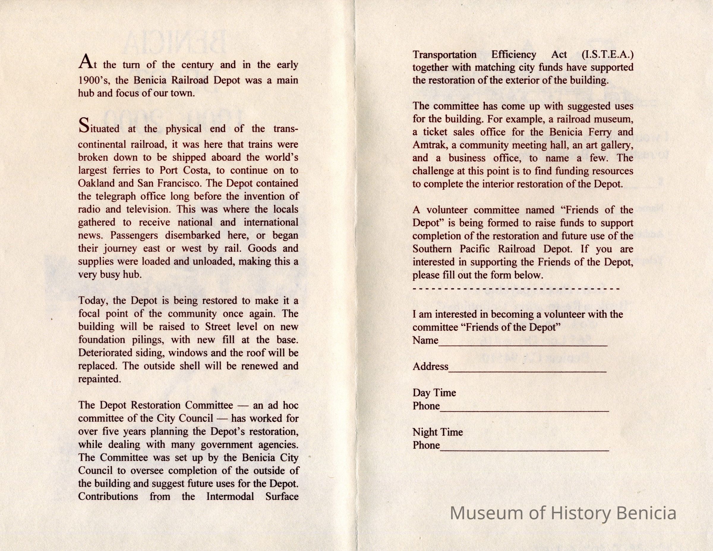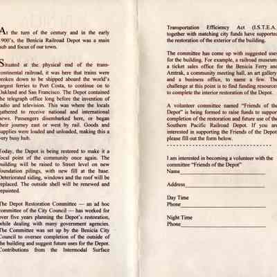Pamphlet for the restoration of the Benicia train depot. The title was "Benicia Depot 1900-2000.