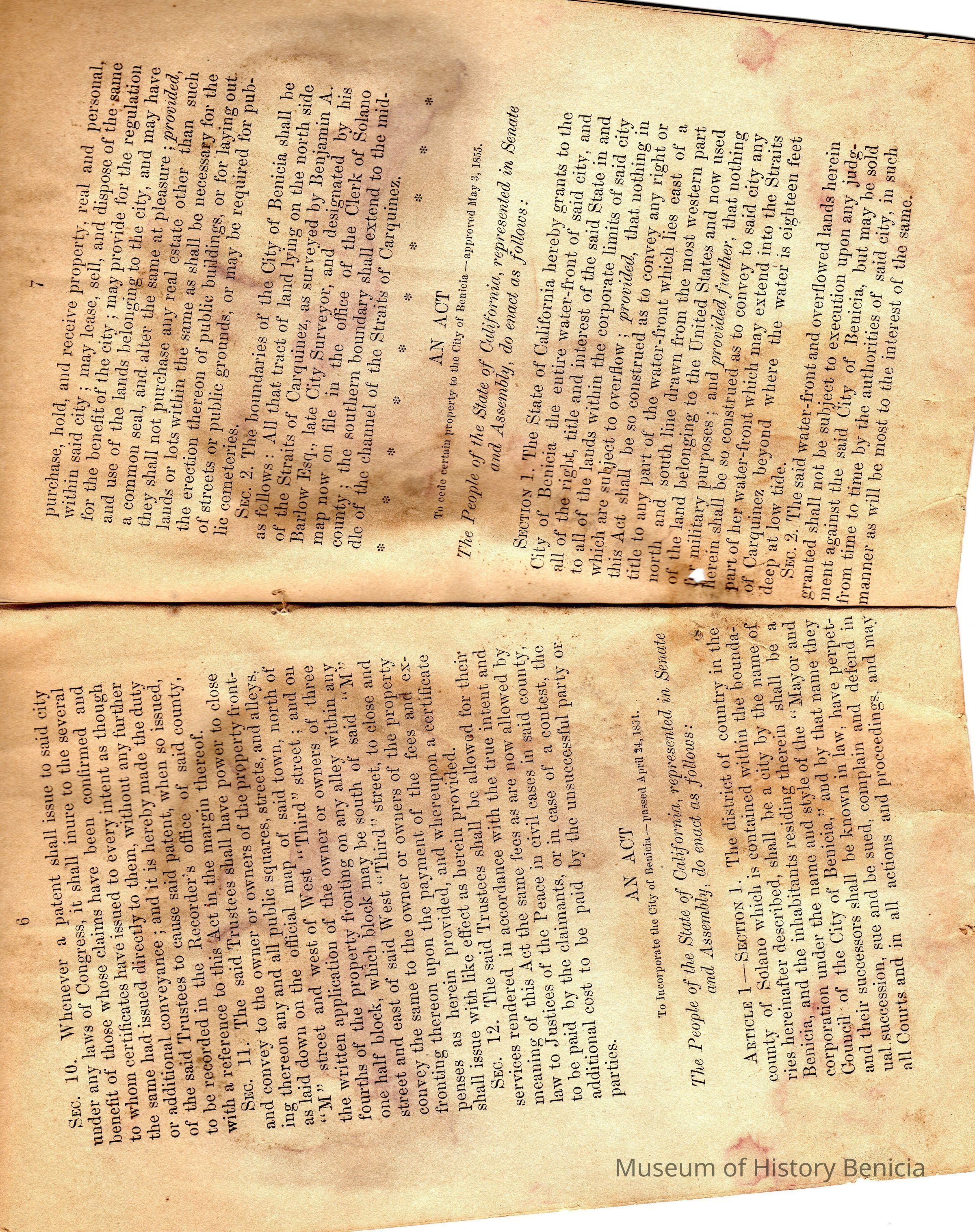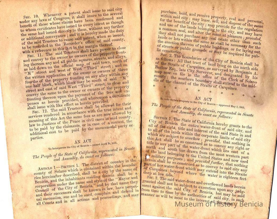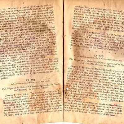 Part of a book showing legislative actions by the California state legislature in the 1850s and 1860s. This seems to be a compilation of acts that effect Benicia. For example an act to incorporate Benicia (04/24/1851), to cede property to Benicia (05/03/1855Collection