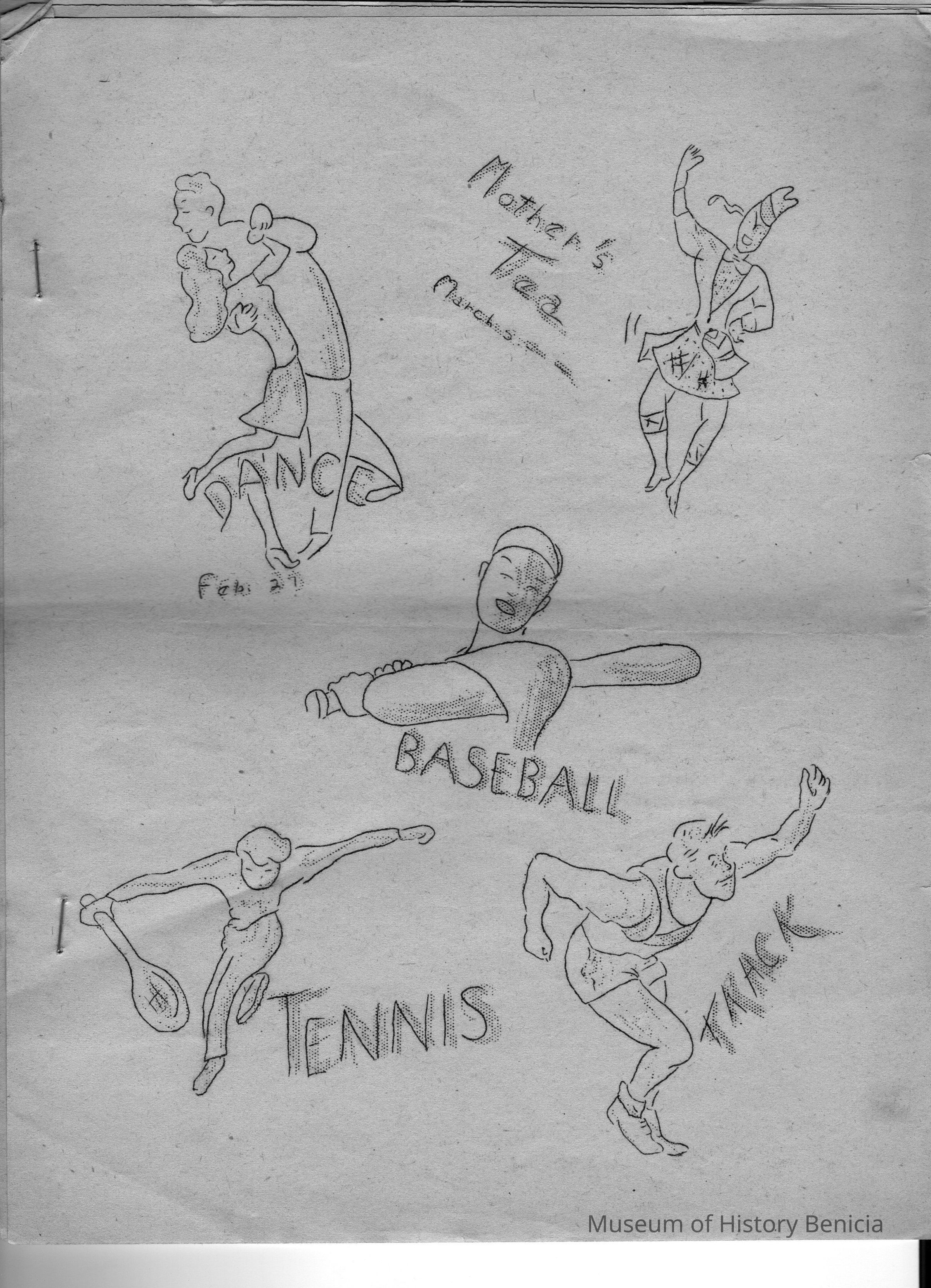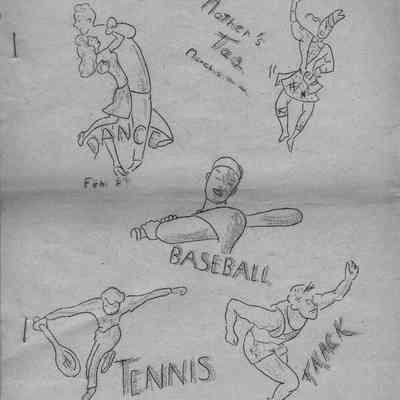 beige cover: multiple drawings for "Mother's Tea March 5", "Dance Feb. 27", "Baseball", "Tennis", "Track"; five pages of articles concernng student activities and gossip.